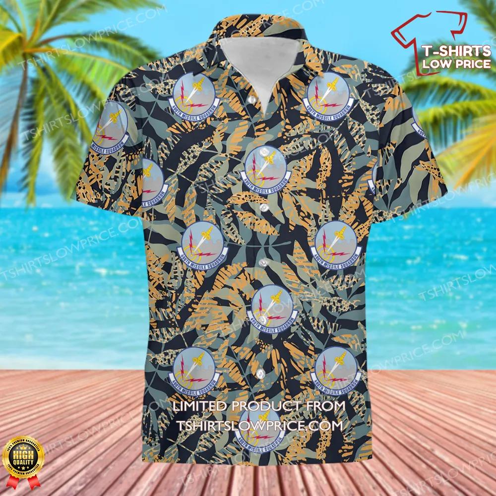 This design combines tropical vibrancy with the iconic emblem of the 490th Missile Squadron. Featuring the squadron's crest, which includes detailed imagery representing their expertise in missile operations, the shirt is set against a dynamic backdrop of leaves in earthy tones. The contrast between the tropical motifs and the military insignia creates a unique balance of relaxation and readiness, symbolizing the calm yet decisive approach of the squadron. The intricate layout ensures every detail stands out, making it a conversation starter for all who see it.