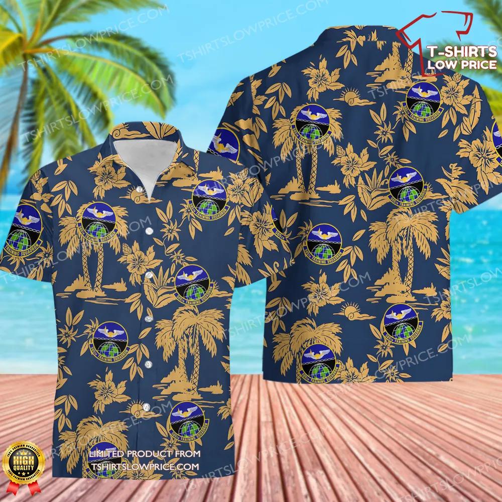 The shirt's striking design combines the lush beauty of tropical palm trees and hibiscus flowers with the bold emblem of the 505th Training Squadron. The intricate detailing of the squadron's insignia—featuring a globe, aircraft, and command elements—symbolizes their unwavering commitment to global defense and coordination. The harmonious mix of golden floral patterns against a calming navy background captures the synergy between strength and serenity, creating a truly memorable piece of apparel.