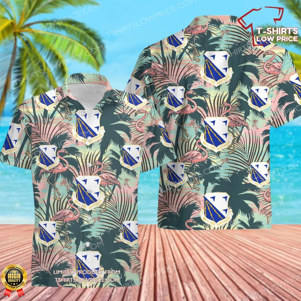 The intricate design features a seamless blend of the 30th Air Division emblem set against a lush backdrop of tropical flora and graceful flamingos. The emblem, with its bold blue and gold accents, symbolizes the strength and vigilance of the division, while the surrounding natural elements enhance the shirt's laid-back, island-inspired aesthetic. The contrast between military heritage and tropical motifs creates a perfect harmony, making this shirt a standout piece for any occasion.