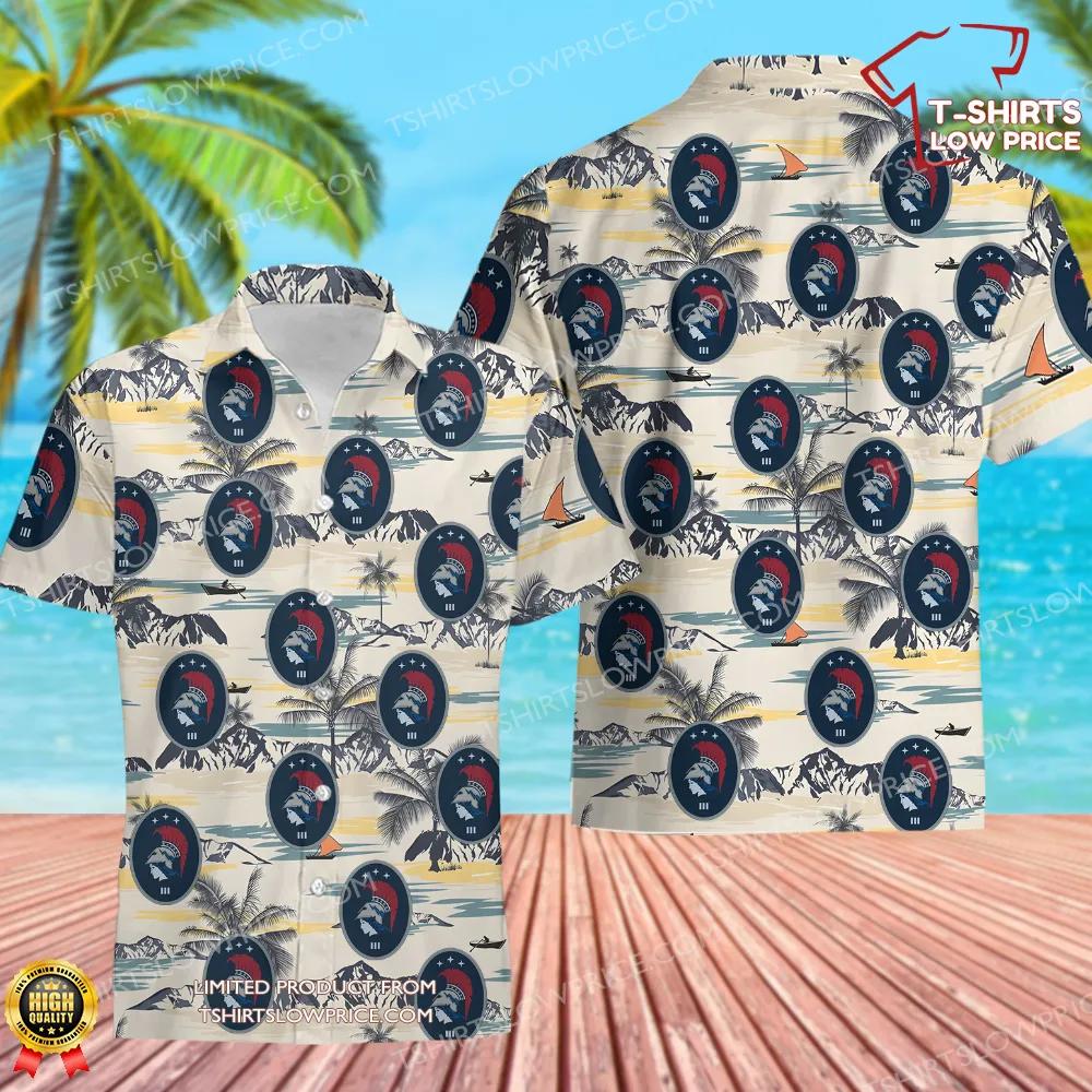 This shirt’s design masterfully blends the 3d Combat Training Squadron’s emblem with tropical Hawaiian themes. The bold crest, featuring a striking Spartan profile set against a starry backdrop, symbolizes strength and vigilance. Surrounding the emblem are serene landscapes of palm trees, ocean waves, and mountain peaks, celebrating the blend of military excellence with island-inspired tranquility. The interplay of colors evokes a sense of adventure and dedication, making the shirt not just a fashion piece but a conversation starter.