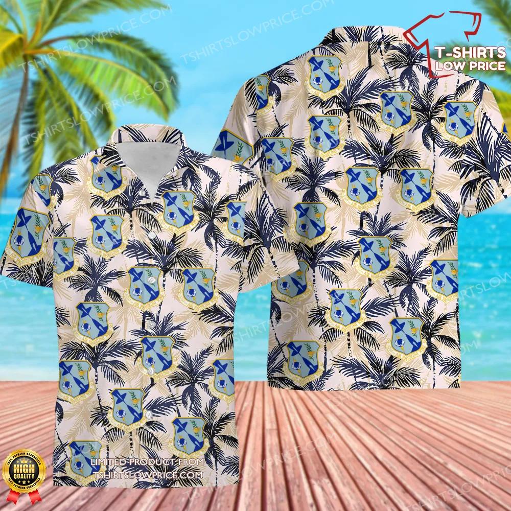 This Hawaiian shirt design creatively showcases the emblem of the 4397th Air Refueling Wing amid a tropical backdrop of palm trees and soothing shades of blue and beige. The intricate detailing of the wing's insignia, complete with its bold colors and heraldic design, reflects its proud heritage. The harmonious blend of aviation symbolism and tropical motifs creates a unique style that honors the past while exuding a relaxed, spirited vibe. Each emblem is thoughtfully arranged, making this shirt a standout piece for history enthusiasts and Air Force supporters alike.