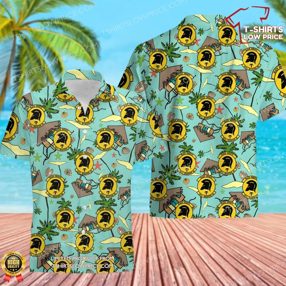 This Hawaiian shirt boasts a vibrant, tropical design featuring the iconic emblem of the 561st Weapons Squadron. The graphic incorporates lush palm trees, serene beach huts, and playful oceanic motifs, creating a vivid backdrop to the squadron's bold logo. The logo's striking silhouette stands out against a bright, cheerful palette, highlighting the squadron's spirit of resilience and innovation while blending seamlessly with the island-inspired theme. This design is a perfect fusion of military pride and laid-back vacation vibes, making it truly unique.