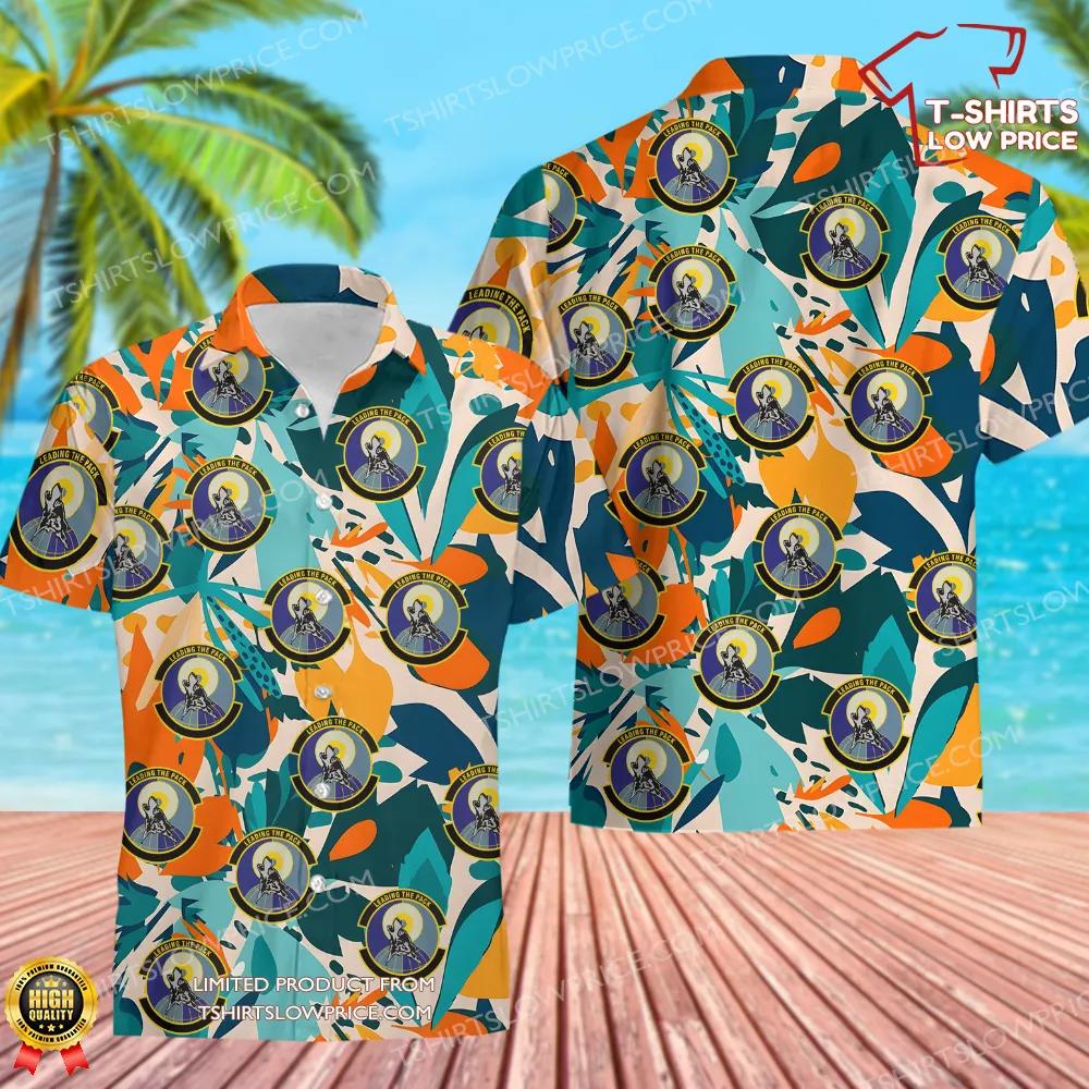 The graphic design of this Hawaiian shirt boasts a lively array of tropical patterns interwoven with the official emblems of the 581st Software Engineering Squadron. The bold color palette of teal, orange, and white harmonizes beautifully with the detailed insignias, creating a visual celebration of technological advancement and dedication. Each emblem, meticulously incorporated into the tropical aesthetic, is a tribute to the squadron’s commitment to excellence. The contrast between the vibrant greenery and symbolic insignias evokes a sense of innovation rooted in tradition, making it a standout addition to any wardrobe.