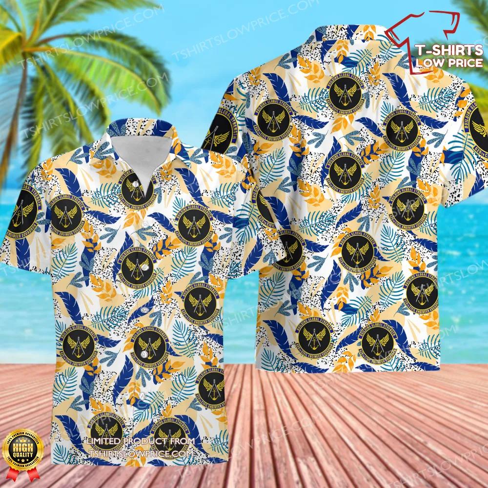 This Hawaiian shirt features a vibrant design that combines tropical-inspired patterns with the official emblem of the 628th Civil Engineer Squadron. The intricate balance of leafy motifs in shades of blue, yellow, and white creates a lively backdrop for the squadron’s emblem. The badge symbolizes the squadron’s core values of service, skill, and precision. This unique fusion of island vibes and military pride makes the shirt not only eye-catching but also deeply meaningful, honoring the unit’s mission to protect and serve.