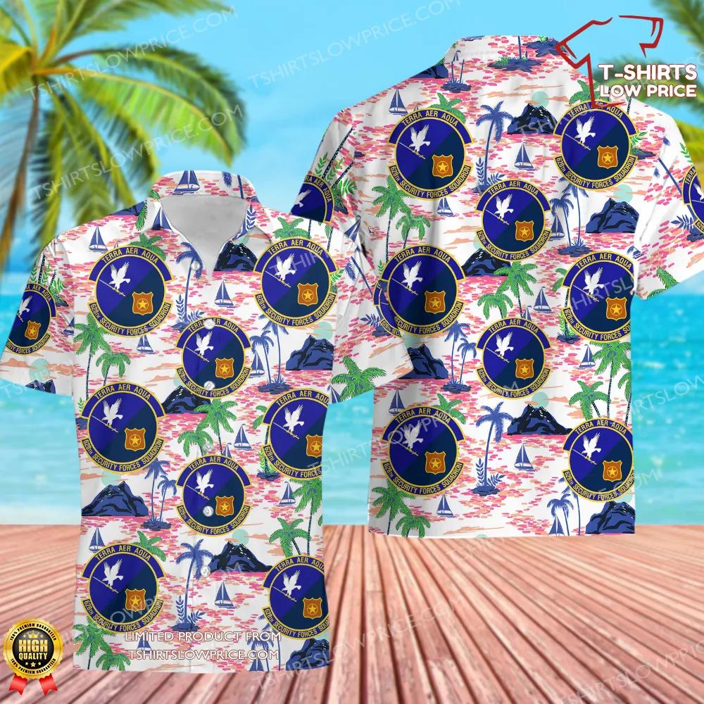 The vibrant design showcases the official emblem of the 628th Security Forces Squadron proudly displayed across a tropical Hawaiian backdrop. The emblem, featuring a striking eagle in flight and a golden shield, symbolizes vigilance and strength, surrounded by the motto "Terra Aer Adua." Complementing this are palm trees, sailboats, and serene ocean waves, creating a perfect harmony of military pride and island vibes. The intricate patterns and bold colors make this shirt a standout tribute to the squadron's mission and heritage.