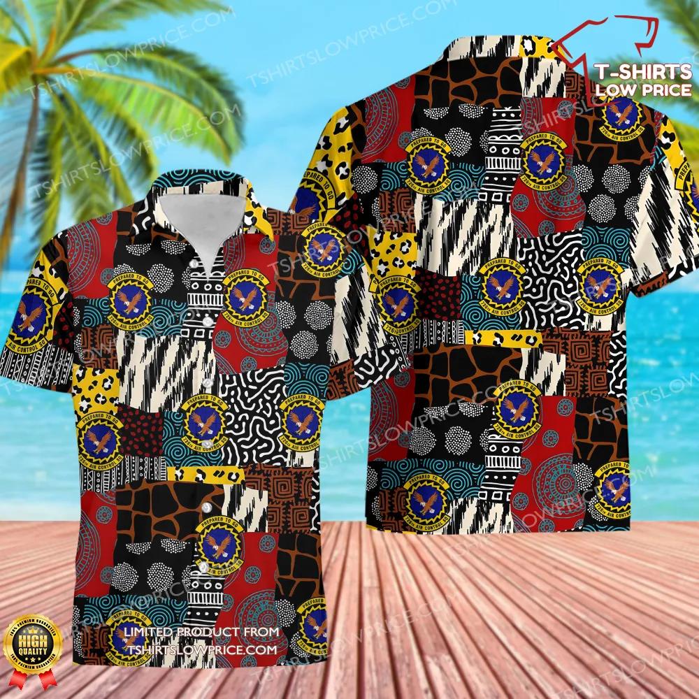 This Hawaiian shirt features a vibrant and intricate design celebrating the 726th Air Control Squadron's mission and heritage. The bold patterns blend geometric shapes, tribal-inspired prints, and rich colors like red, yellow, and black. Interwoven throughout the design are the official emblems of the 726th ACS, showcasing the unit’s insignia and further enhancing the theme of dedication and service. The mix of elements creates a visually striking and meaningful representation of the squadron’s legacy, perfect for those connected to or inspired by their mission.