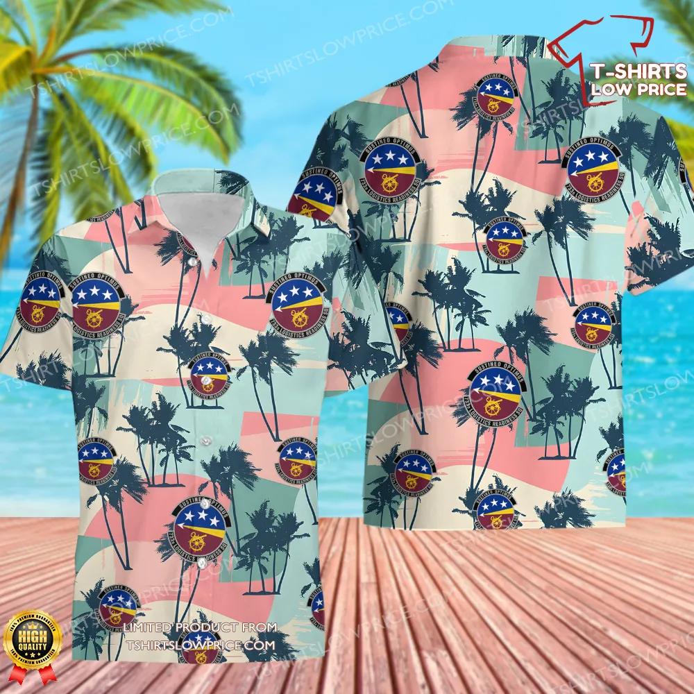 This Hawaiian shirt showcases a vibrant design that blends tropical elements with the emblem of the 733d Logistics Readiness Squadron. The artwork features a picturesque backdrop of palm trees and soft pastel tones, capturing the relaxed island vibe while prominently displaying the squadron’s insignia. The detailed emblem, featuring stars and a fuel symbol, reflects their dedication to precision and service. Each component of the design conveys a sense of pride, unity, and honor for this exceptional Air Force unit.