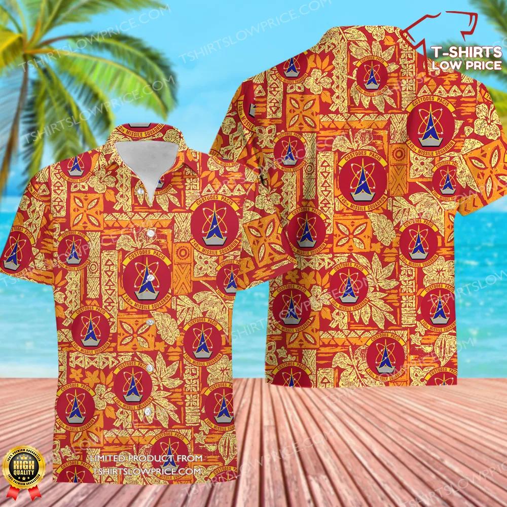 The shirt's vibrant design features intricate red and gold patterns fused with tropical elements. At the center of the design is the emblem of the 740th Missile Squadron, boldly displayed with its iconic missile graphic surrounded by its motto, "Custodes Pacis" (Guardians of Peace). The intricate floral motifs and geometric shapes complement the squadron emblems, creating a striking balance between military pride and Hawaiian-inspired artistry. Each element pays tribute to the squadron's mission, history, and commitment while radiating a distinctive island aesthetic.