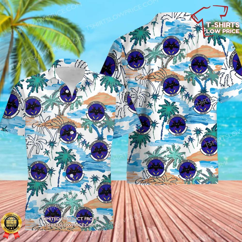 This Hawaiian shirt features a stunning blend of elements that celebrate the 890 MSFS’s vital role. The squadron’s emblem is prominently displayed, incorporating bold hues of blue and gold, symbolizing vigilance and excellence. These emblems are interspersed with tropical motifs, including palm trees and serene landscapes, adding a touch of relaxation and celebration to the design. The juxtaposition of the squadron’s powerful insignia with the calm, breezy Hawaiian aesthetic creates a unique and meaningful tribute to those who protect our nation’s security.