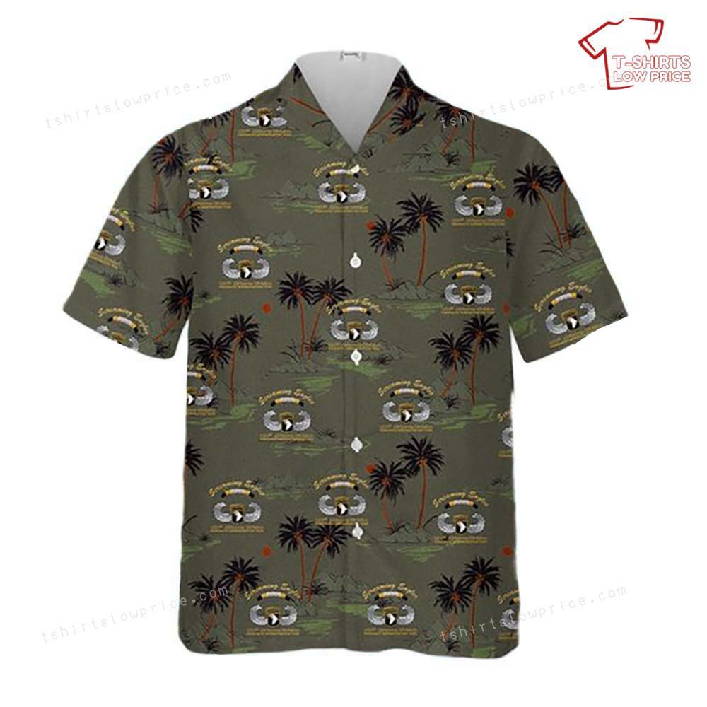 The printed design features a meticulous illustration that brings together the essence of the 101st Airborne Division and the spirit of tropical leisure. With the Screaming Eagles insignia prominently displayed, the shirt highlights the fearless paratroopers in action. The surrounding lush palm trees and vibrant sunset hues offer a vivid contrast, creating a dynamic representation of bravery and relaxation. This fusion of themes captures the essence of military valor in a design that’s both eye-catching and meaningful.