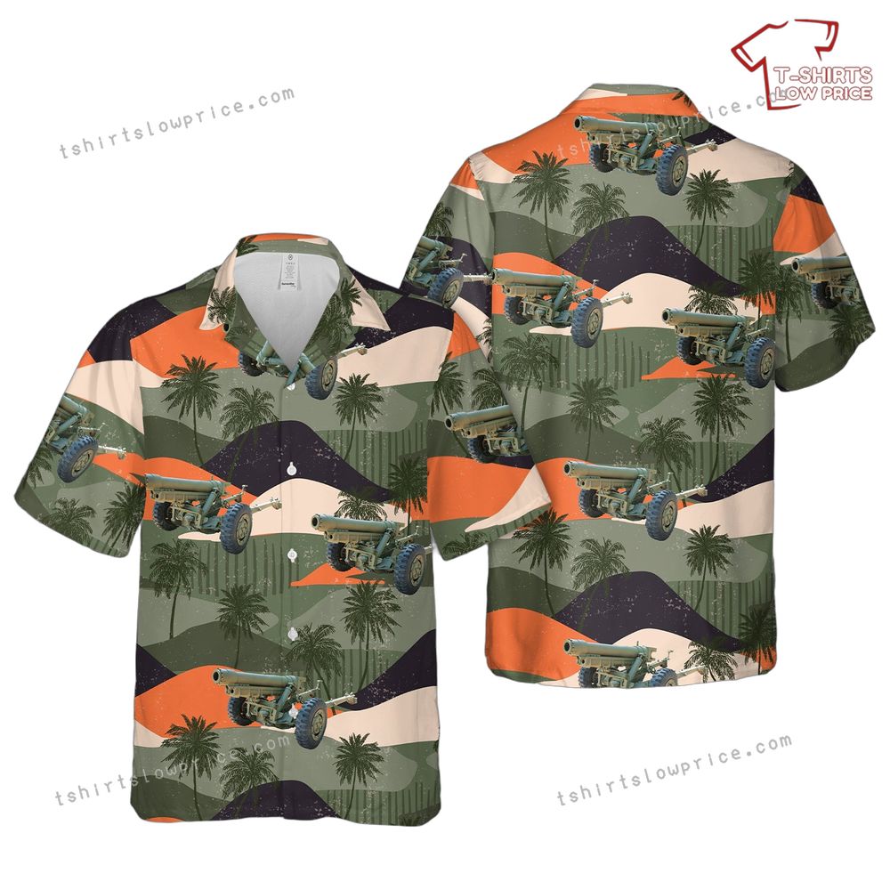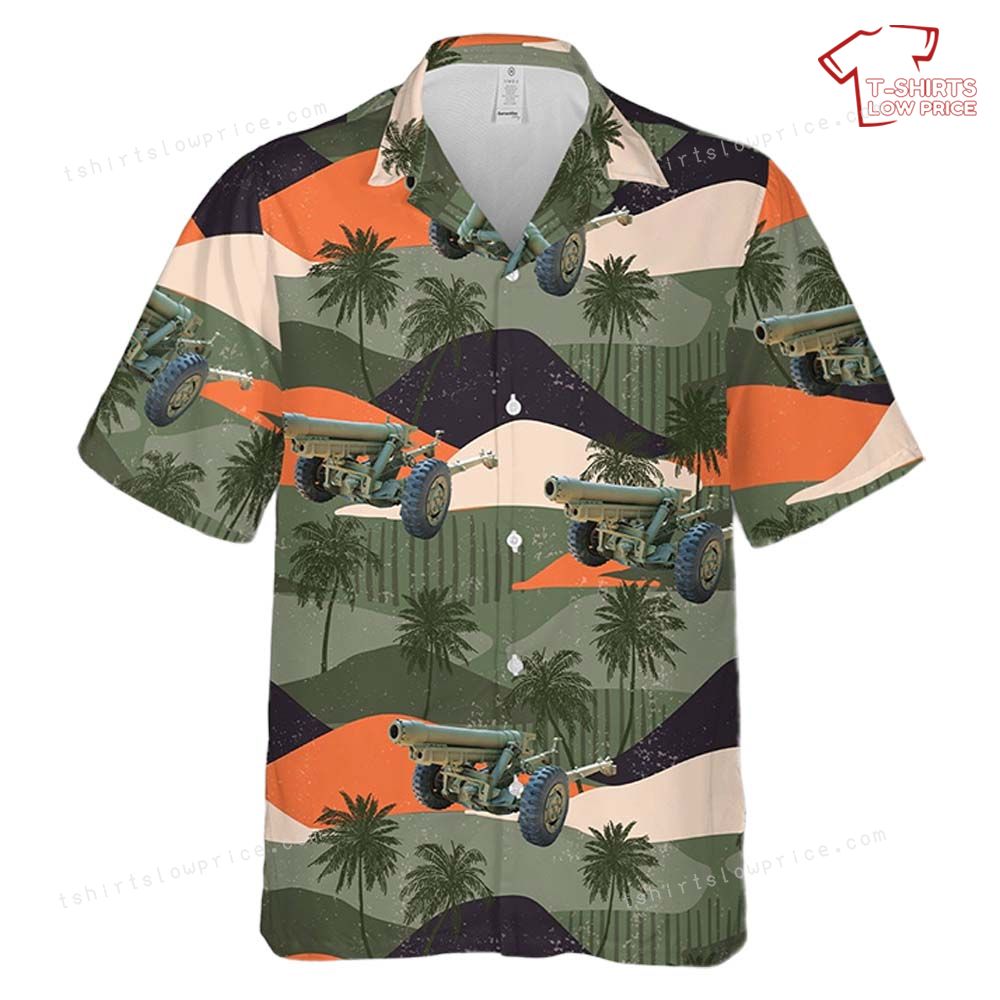 Related keywords: US Army artillery shirt, 105 mm Howitzer design, military-themed Hawaiian shirt, tropical cannon graphic