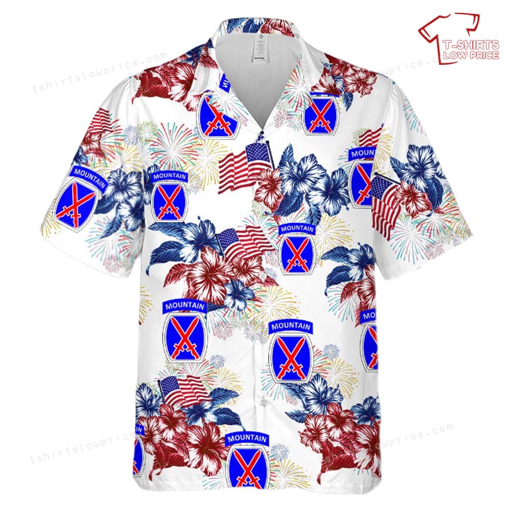 Related keywords: 10th Mountain Division shirt, patriotic Hawaiian shirt, Fourth of July apparel, military insignia design