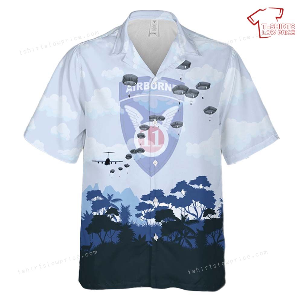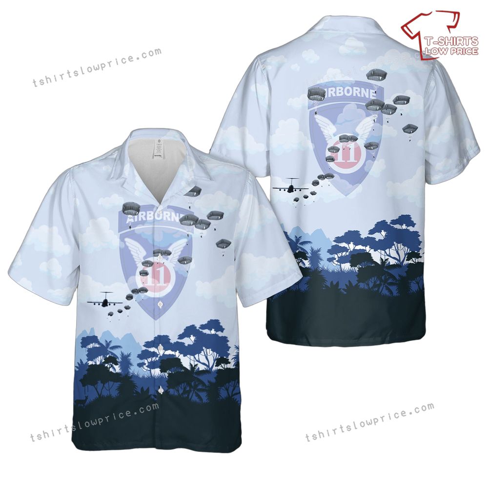 Related keywords: 11th Airborne Division shirt, military parachute design, C-130 aircraft graphic, airborne-themed Hawaiian shirt