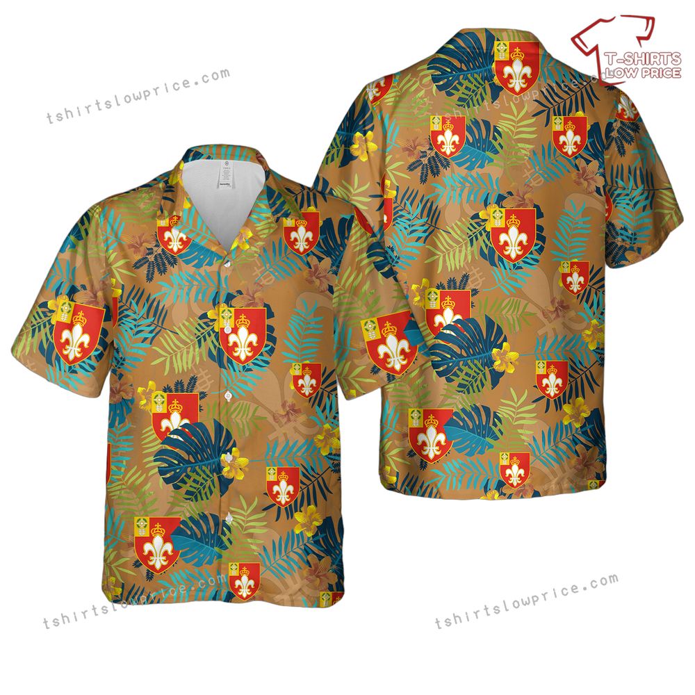 The shirt's design features the distinguished crest of the 12th Field Artillery Regiment, prominently displayed against a backdrop of lush, colorful tropical leaves and hibiscus flowers. The red and gold emblem, complete with the fleur-de-lis and crown, symbolizes the regiment's rich history and achievements. This artistic composition effortlessly weaves military pride into a Hawaiian-style canvas, creating a seamless fusion of respect and leisure. The layout evokes a sense of pride and camaraderie while staying true to the island-inspired aesthetic.