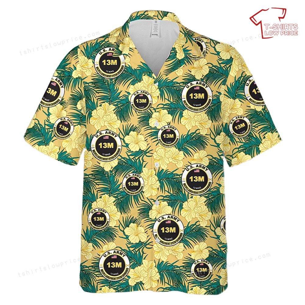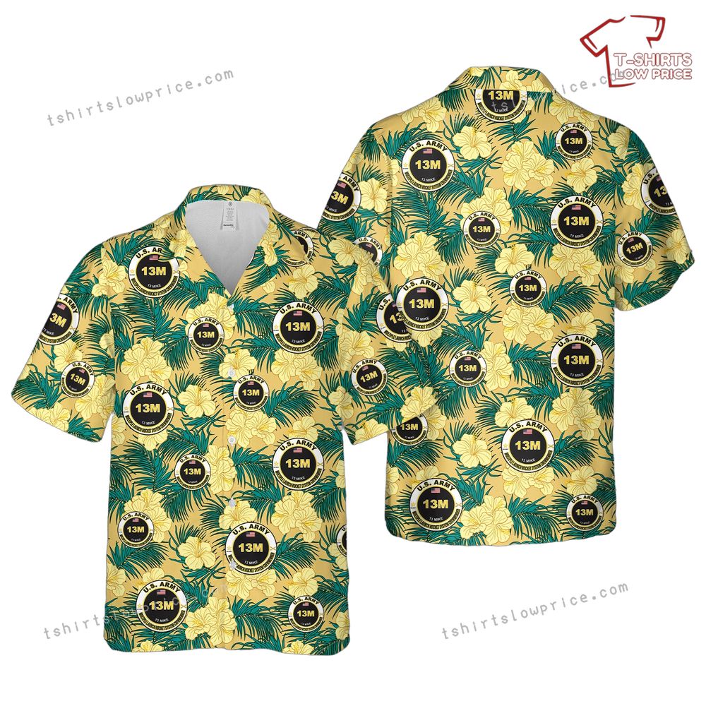 Related keywords: 13M insignia, U.S. Army MOS apparel, patriotic Hawaiian shirt, rocket system crew design
