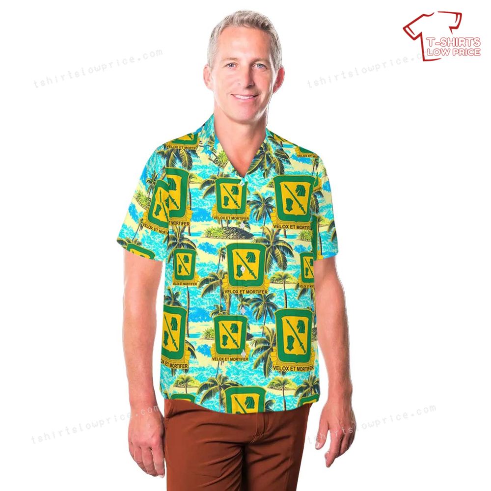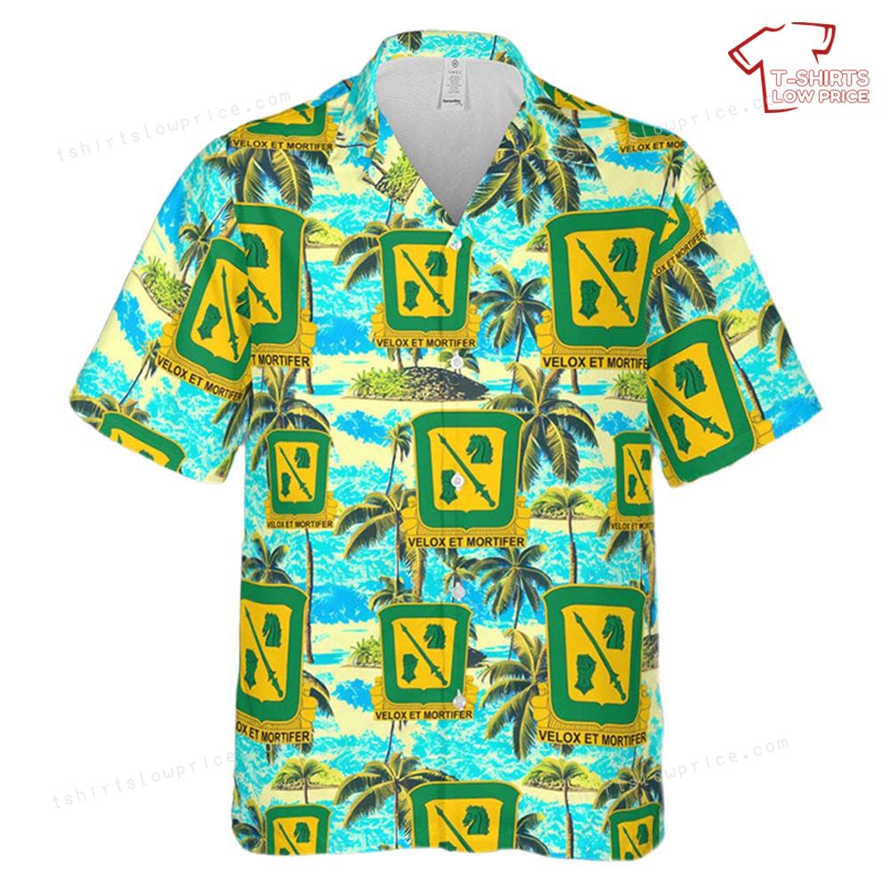 Related keywords: 18th Cavalry Regiment shirt, Velox et Mortifer apparel, military Hawaiian shirt, U.S. Army tropical design