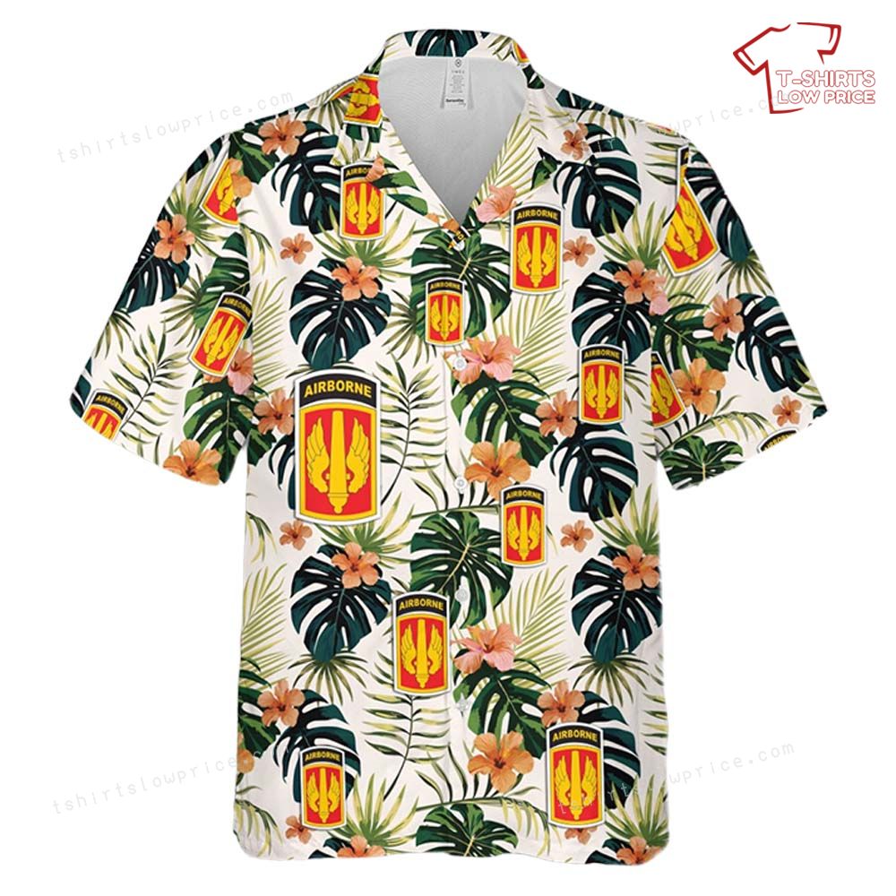 Related keywords: 18th Field Artillery Brigade shirt, Airborne emblem apparel, military tropical design, Army pride Hawaiian shirt