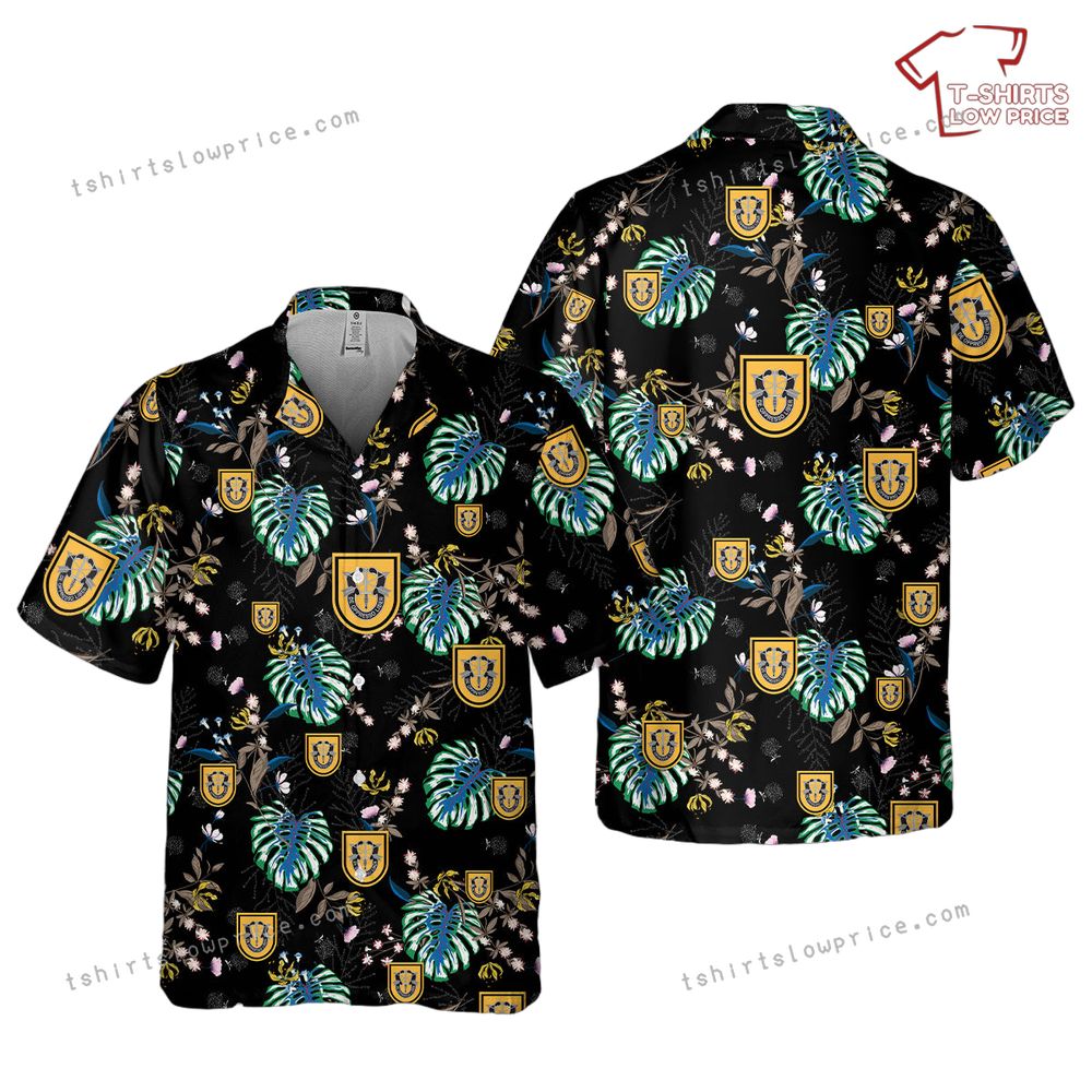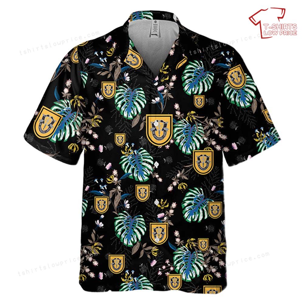 Related keywords: Special Forces insignia, tropical military wear, 1st SFG apparel, patriotic Hawaiian shirt
