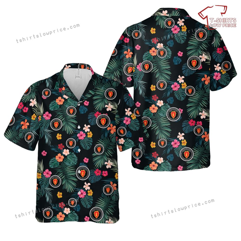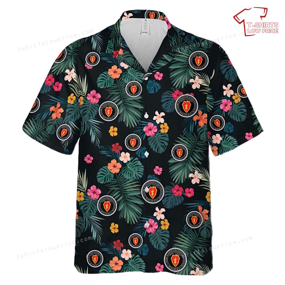 The shirt features a lively array of tropical flowers and lush green leaves, interspersed with the iconic insignia of the 25th Infantry Division. This bold pattern brings together the warmth and allure of Hawaiian aesthetics with the strength and honor of a renowned military division. Each element is thoughtfully placed to create a harmonious balance between the exuberant floral elements and the distinctive badges, celebrating a unique fusion of joy and valor. The result is a visually stunning piece that embodies a sense of adventure and pride, perfect for those who appreciate history and style.