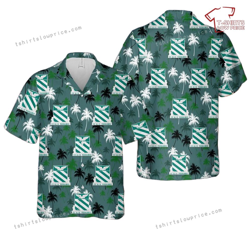 The printed graphic on this Hawaiian shirt features the emblematic insignia of the US Army's 2nd Battalion, 3rd Aviation Regiment. With bold symbols and distinctive colors, each element tells a story of valor and loyalty. The tropical backdrop of vibrant palm trees adds a refreshing contrast, bringing a sense of adventure and leisure. The intricate design invites admiration, creating a harmonious balance between military homage and island charm. Perfect for those who appreciate detailed artwork with meaningful undertones.