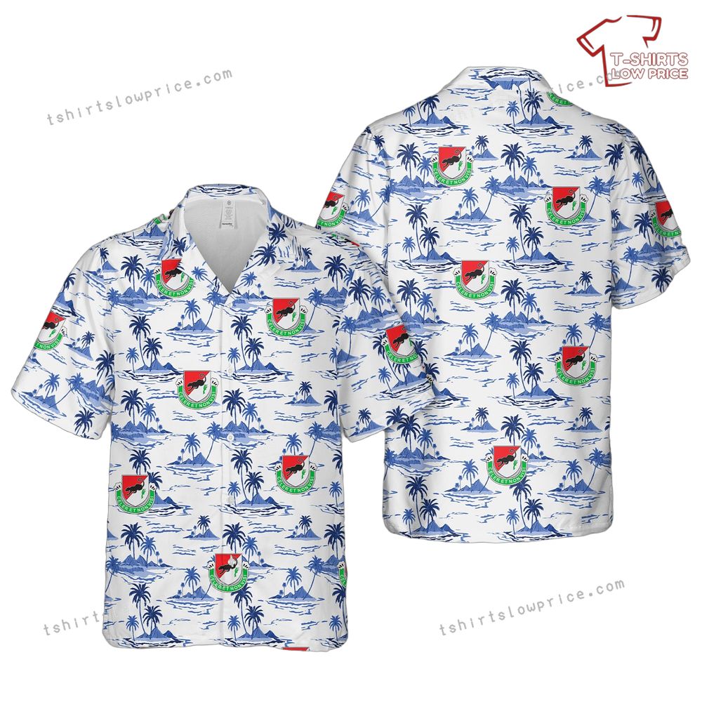 The design highlights the iconic emblem of the 31st Cavalry Regiment, seamlessly integrated into a lush Hawaiian theme. Bold red shields and green accents contrast beautifully against a rich blue-and-white tropical backdrop, which includes palm trees, mountains, and peaceful ocean waves. The arrangement evokes both the regiment’s strength and the serenity of island life, creating a dynamic visual narrative. The unique combination of military symbolism and tropical motifs makes this shirt not just a garment, but a piece of wearable art.