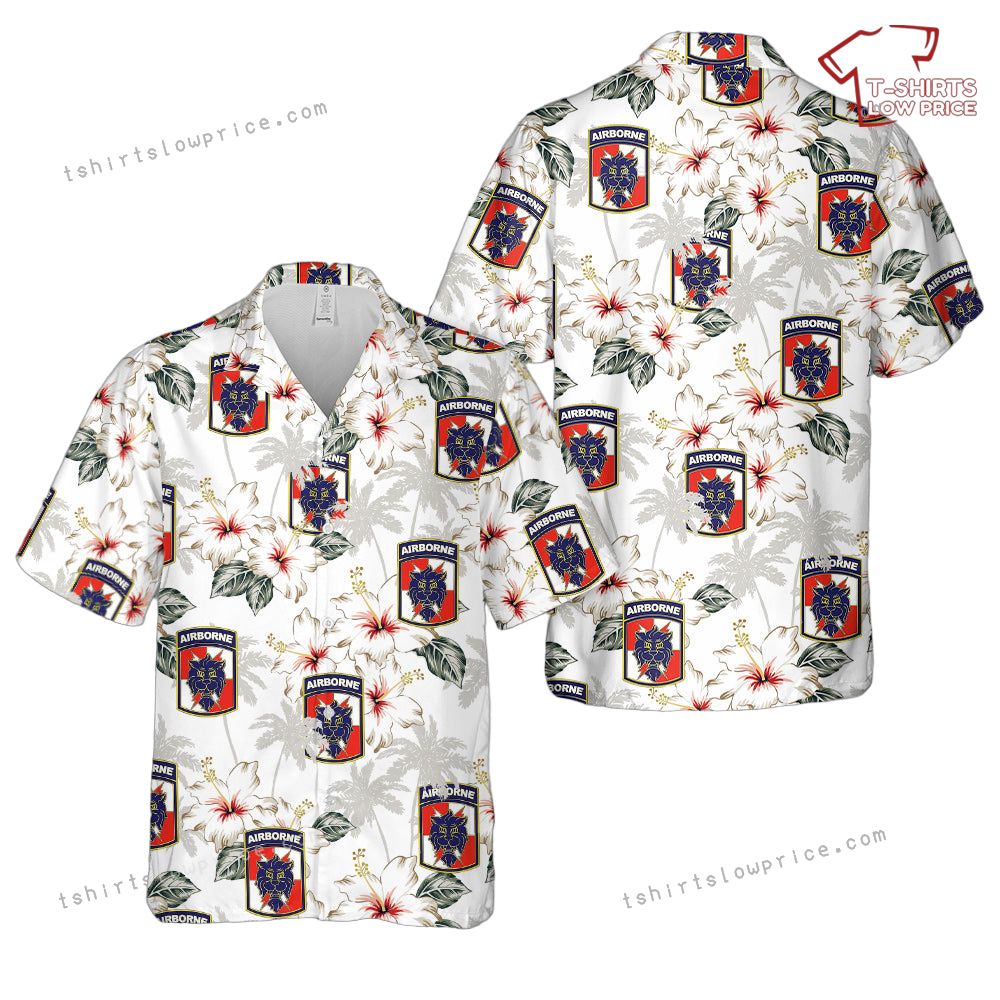 The shirt features an intricate pattern of lion head insignias symbolizing strength and leadership, complemented by vibrant hibiscus flowers and lush green palm leaves. This seamless fusion of military symbolism and tropical scenery creates a visual masterpiece. The bold Airborne Brigade logos add a sense of heritage and pride, while the Hawaiian elements bring a relaxed, vacation-ready vibe. It's a design that balances honor and relaxation, making it perfect for showcasing your respect for the military with flair.