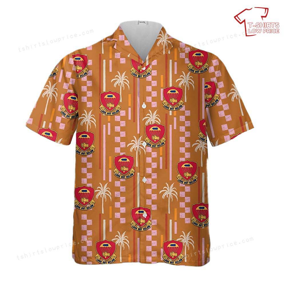 Related keywords: 376th PFAB insignia, US Army Hawaiian shirt, parachute battalion apparel, military history clothing