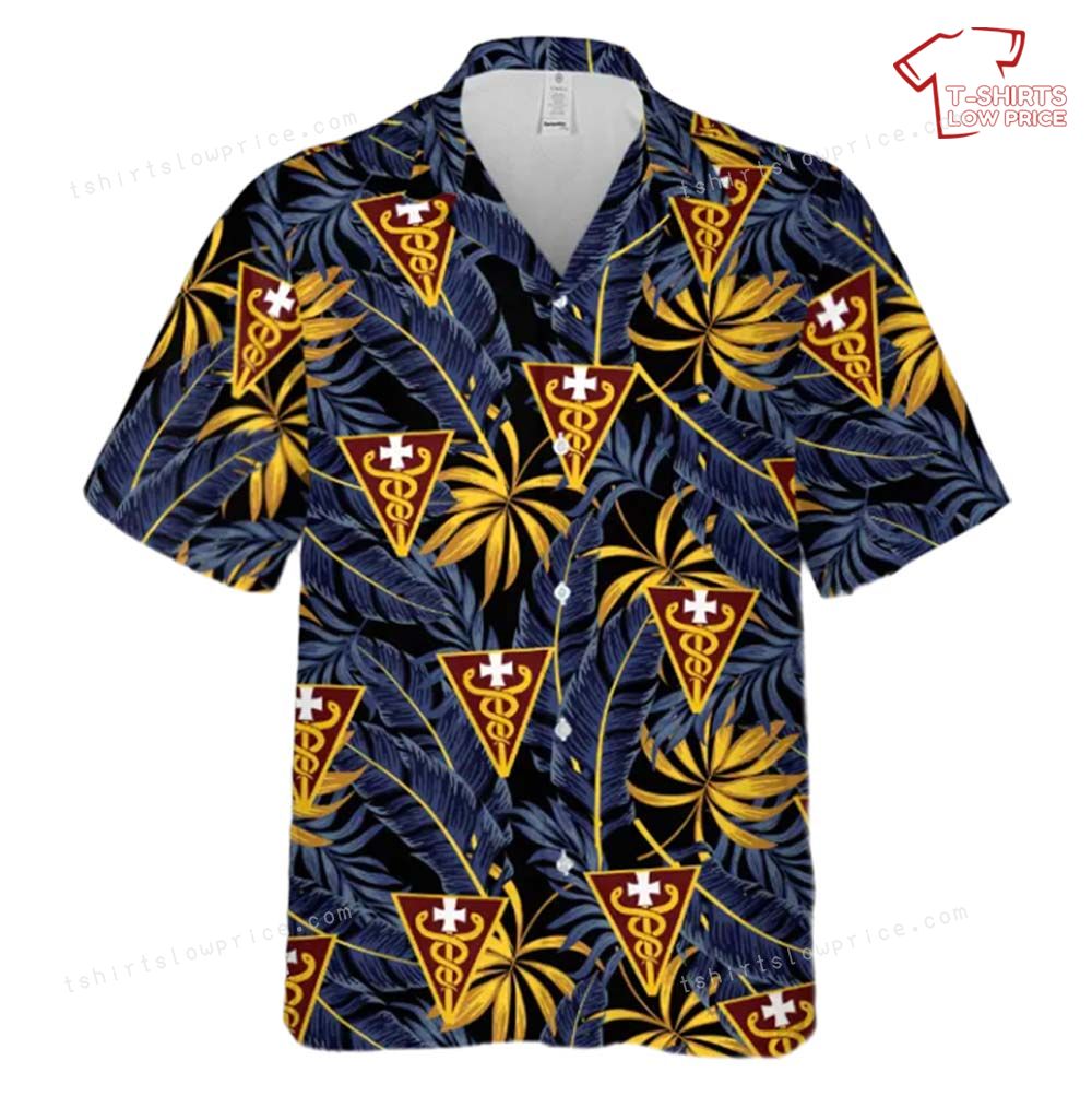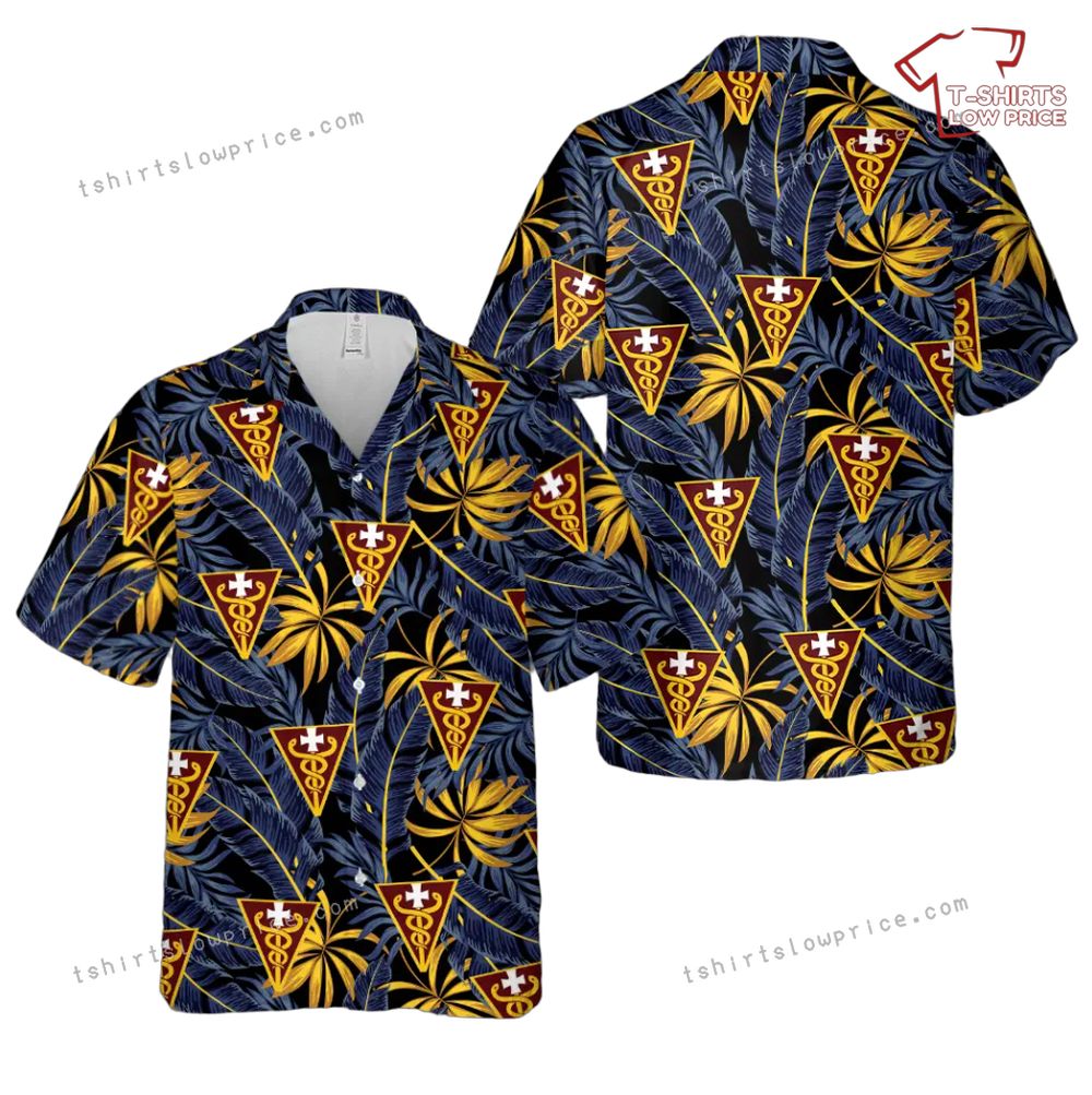 Related keywords: US Army medical insignia shirt, 3rd Medical Command apparel, military Hawaiian shirt, caduceus tropical design