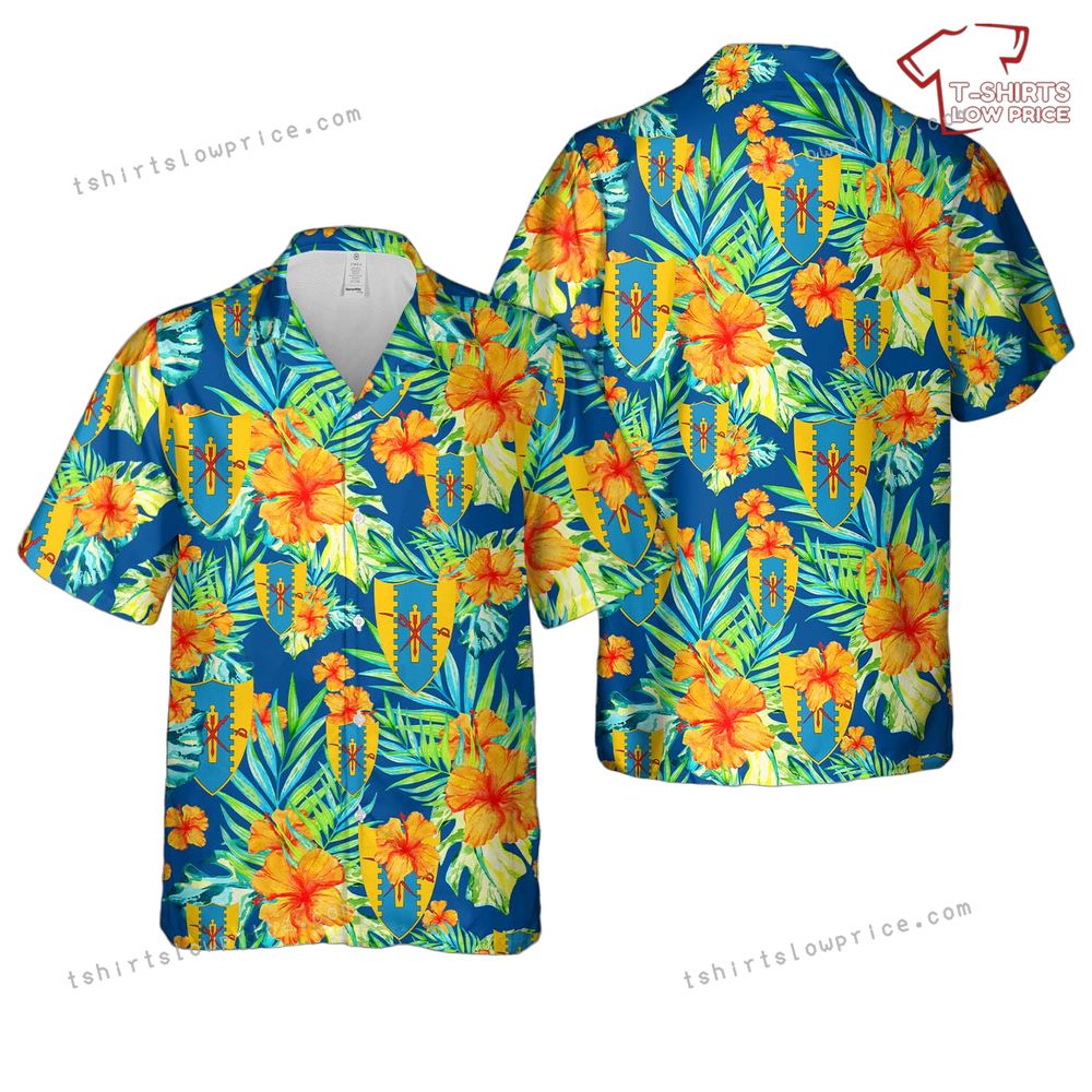 Show off your pride for the US Army 4th Cavalry Regiment in a vibrant and stylish way! This Hawaiian shirt merges the regiment’s iconic emblem with a lush and colorful tropical design. The bright yellow shields pop against vivid green palm leaves and striking orange hibiscus flowers, creating a unique blend of military honor and island vibes. It’s the perfect way to stand out while showcasing your allegiance to a storied unit of the US Army.