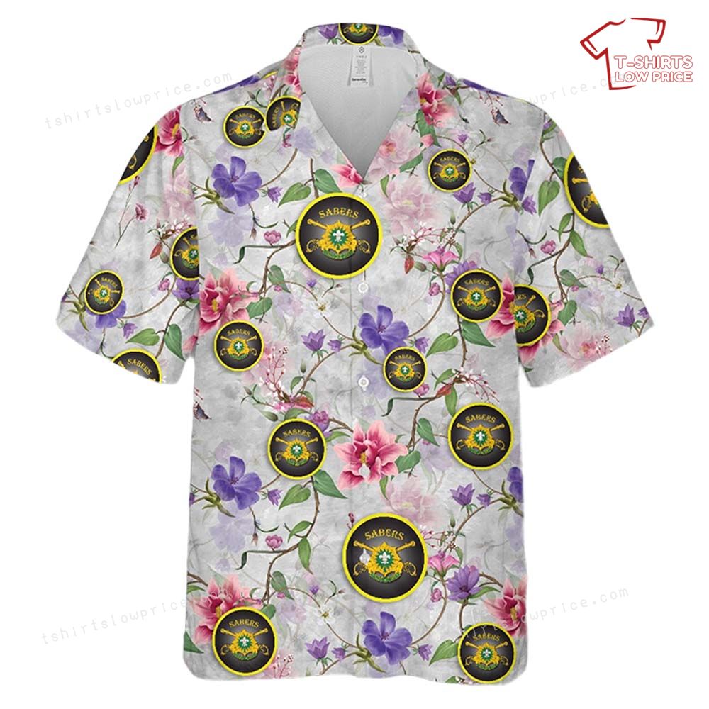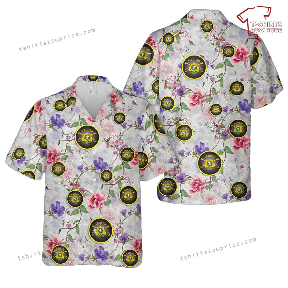 The shirt’s design showcases the bold insignia of the 4th Squadron, 2d Cavalry Regiment prominently throughout, symbolizing strength and dedication. These emblems are set against a lush floral background packed with vivid purples, pinks, and greens, evoking a carefree, Hawaiian spirit. The combination of military tradition with tropical aesthetics creates a statement of respect and relaxation, making it a standout design. Every element celebrates the Sabers' legacy while offering an eye-catching, artistic appeal.