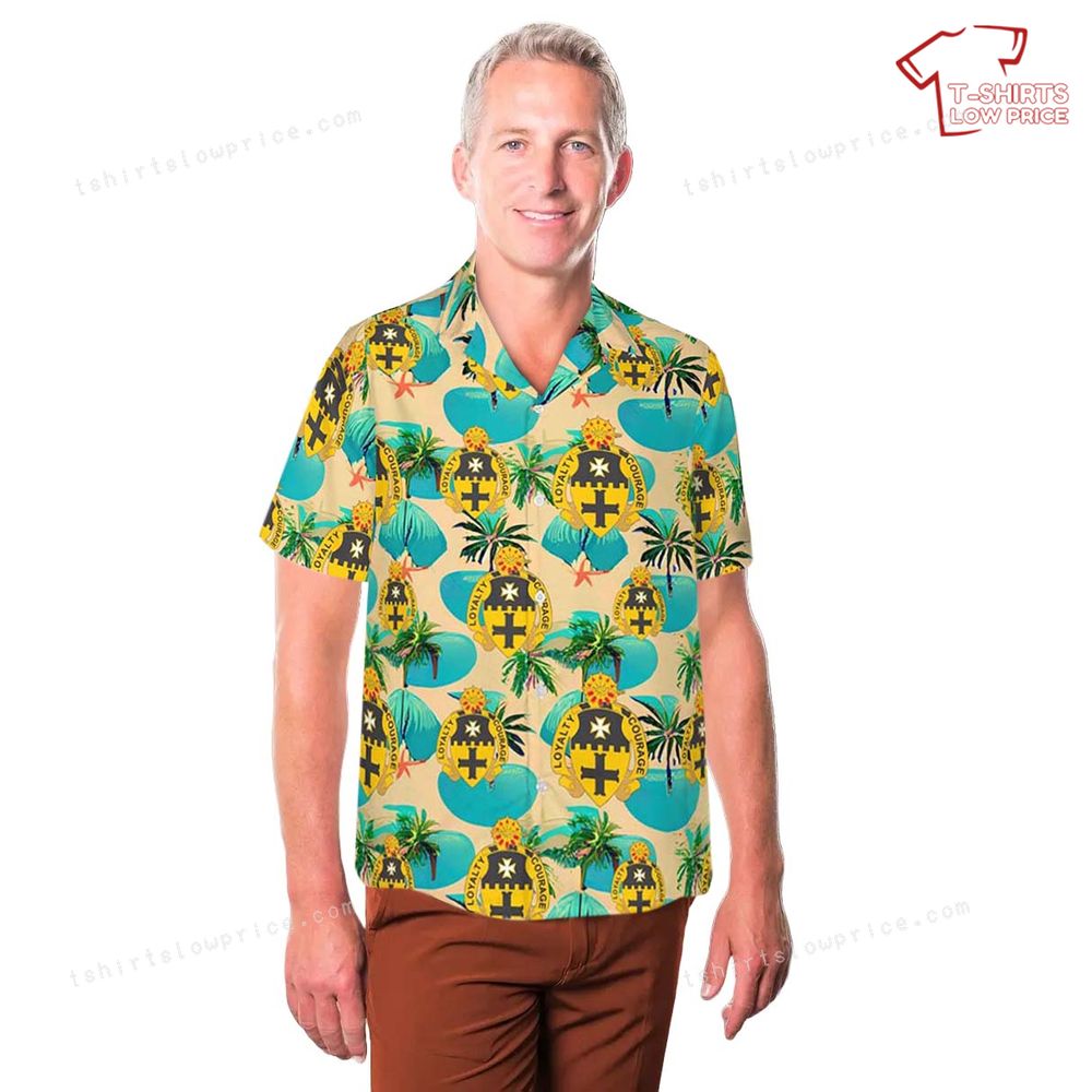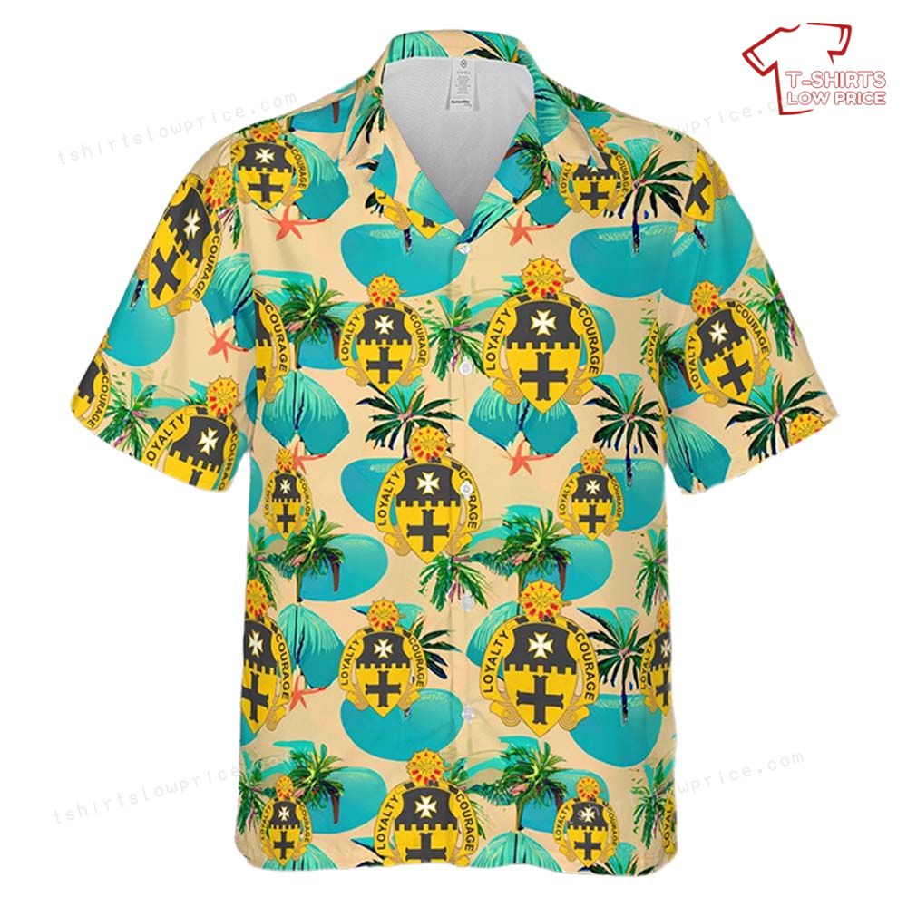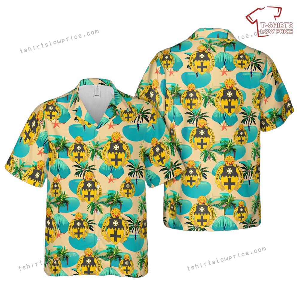 Related keywords: US Army regiment shirt, 5th Cavalry insignia apparel, tropical military design, Hawaiian military tribute shirt