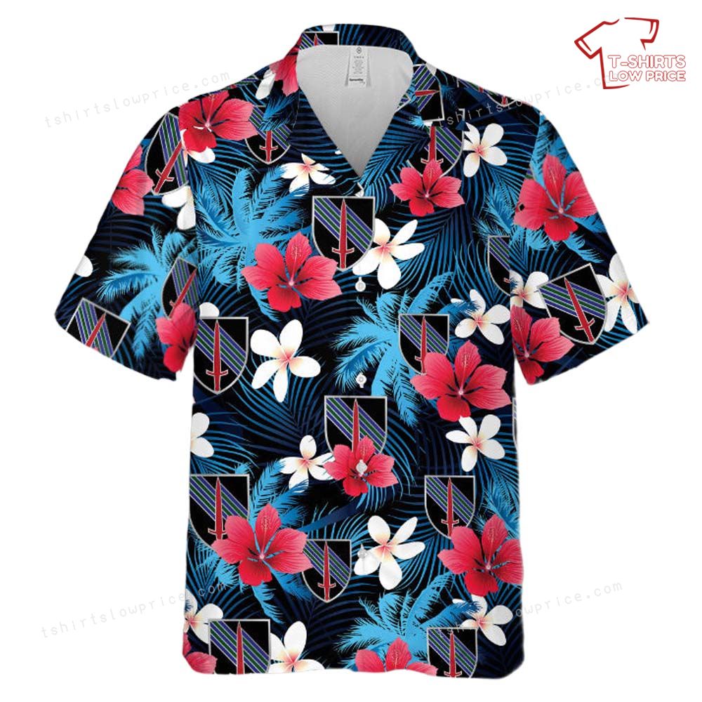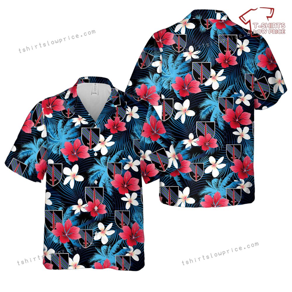 Celebrate the unique blend of military pride and island vibes with this striking Hawaiian shirt inspired by the US Army 5th Security Force Assistance Brigade. The design combines bold tropical flowers in vivid reds and whites with lush blue palm leaves, creating a vibrant and refreshing aesthetic. The iconic 5th SFAB insignia is cleverly integrated into the pattern, making this shirt not only a fashion statement but also a proud nod to the distinguished brigade.