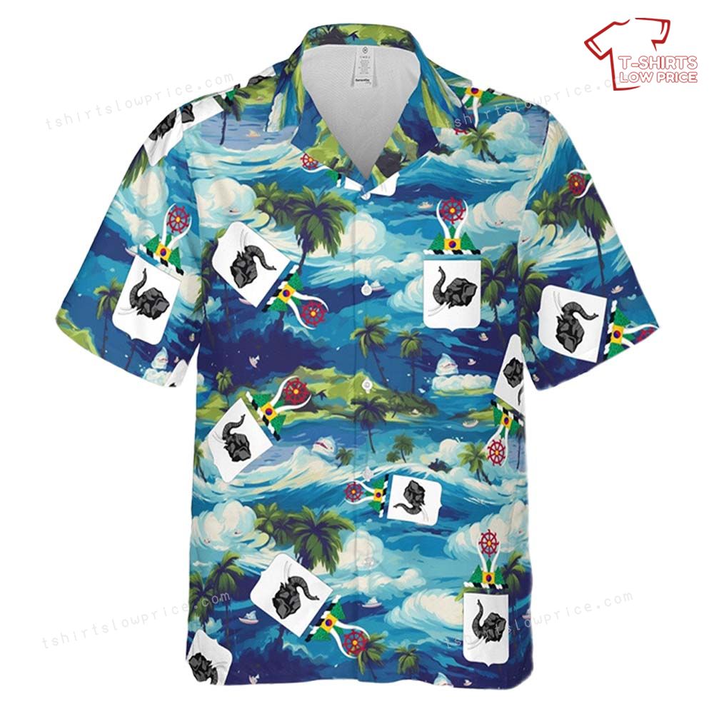 The graphic on this Hawaiian shirt captures the essence of the 64th Armor Regiment, blending powerful imagery with tropical scenes. Iconic black armor silhouettes stand out against the bright, picturesque backdrop of palm trees, clear skies, and distant mountain views, symbolizing resilience and strength. The incorporation of military-inspired emblems and colorful details adds depth and connection to the regiment’s storied history. This vibrant design not only celebrates the regiment but also conveys a sense of adventure and pride.