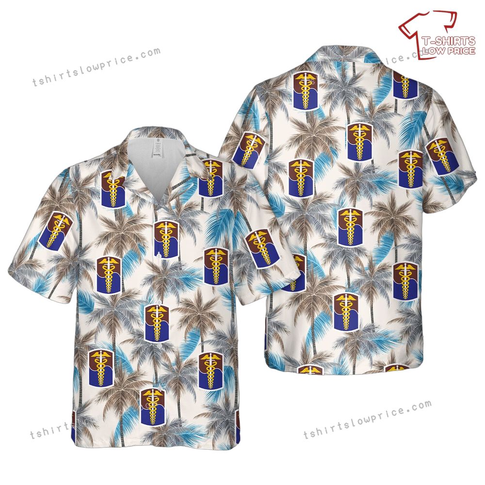 Related keywords: US Army 65th Medical Brigade, military Hawaiian shirt, tropical military apparel, brigade insignia fashion
