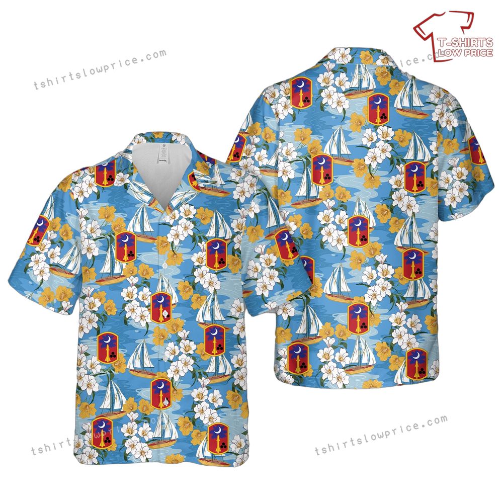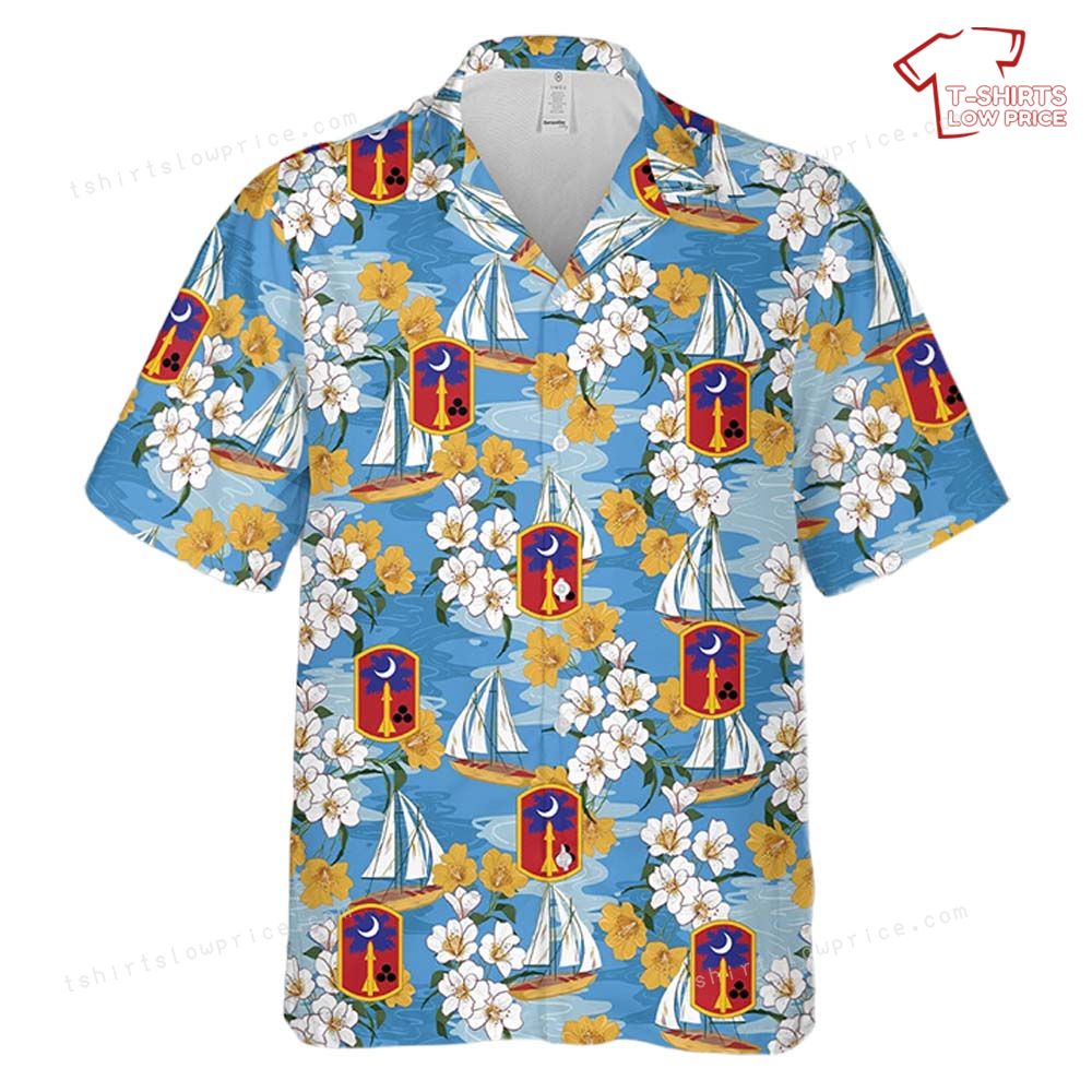 The design on this Hawaiian shirt beautifully combines elements of floral patterns and nautical themes, creating a tapestry of vibrant colors and intricate details. The sailboats glide across a serene ocean backdrop, symbolizing the journey and freedom. Interspersed with tropical flowers, the design adds an exotic flair, while the emblem of the 678th Air Defense Artillery Brigade stands proudly, symbolizing strength and honor. Each element of the artwork tells a story, blending the tranquility of island life with the strength and commitment of the brigade. It's a design that speaks to both adventure and heritage, making it truly unique and visually captivating.