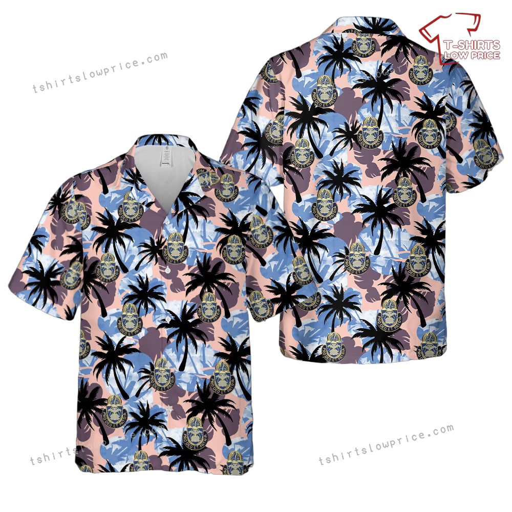 The artwork on this shirt marries the ceremonial elegance of the US Army Chaplain Corps insignia with the relaxed, carefree spirit of a Hawaiian paradise. The insignia, a symbol of guidance and service, stands proudly amidst the contrasting silhouettes of palm trees, creating a seamless blend of tradition and relaxation. The choice of colors—soft blues, purples, and pinks—echoes the beauty of a sunset, serving as a perfect canvas that highlights the insignia’s golden hues. This shirt offers a refreshing take on military-themed apparel, with a design that tells a story of dedication and serenity.