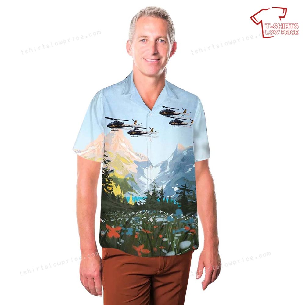 This eye-catching shirt showcases a fleet of helicopters soaring majestically above a breathtaking mountainous landscape. The artwork beautifully combines elements of nature and aviation, with helicopters flying in a synchronized formation over lush forests and towering peaks. The scene evokes a sense of motion and dedication, capturing the dynamic energy of a helicopter demonstration team in action. The composition masterfully blends the thrill of aviation with the serene beauty of nature, making it a perfect piece for enthusiasts and admirers alike.