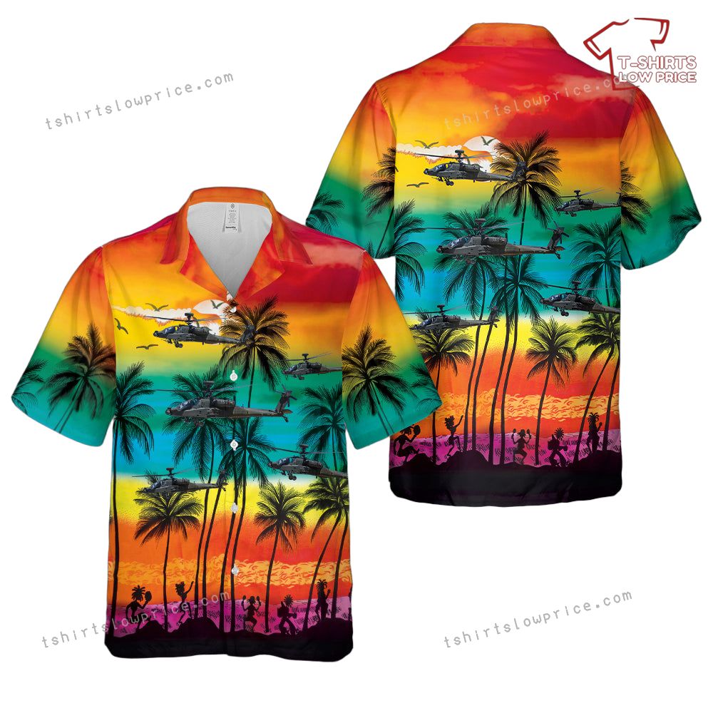 Related keywords: AH-64E Apache Guardian, aviation art, helicopter design, tropical sunset shirt