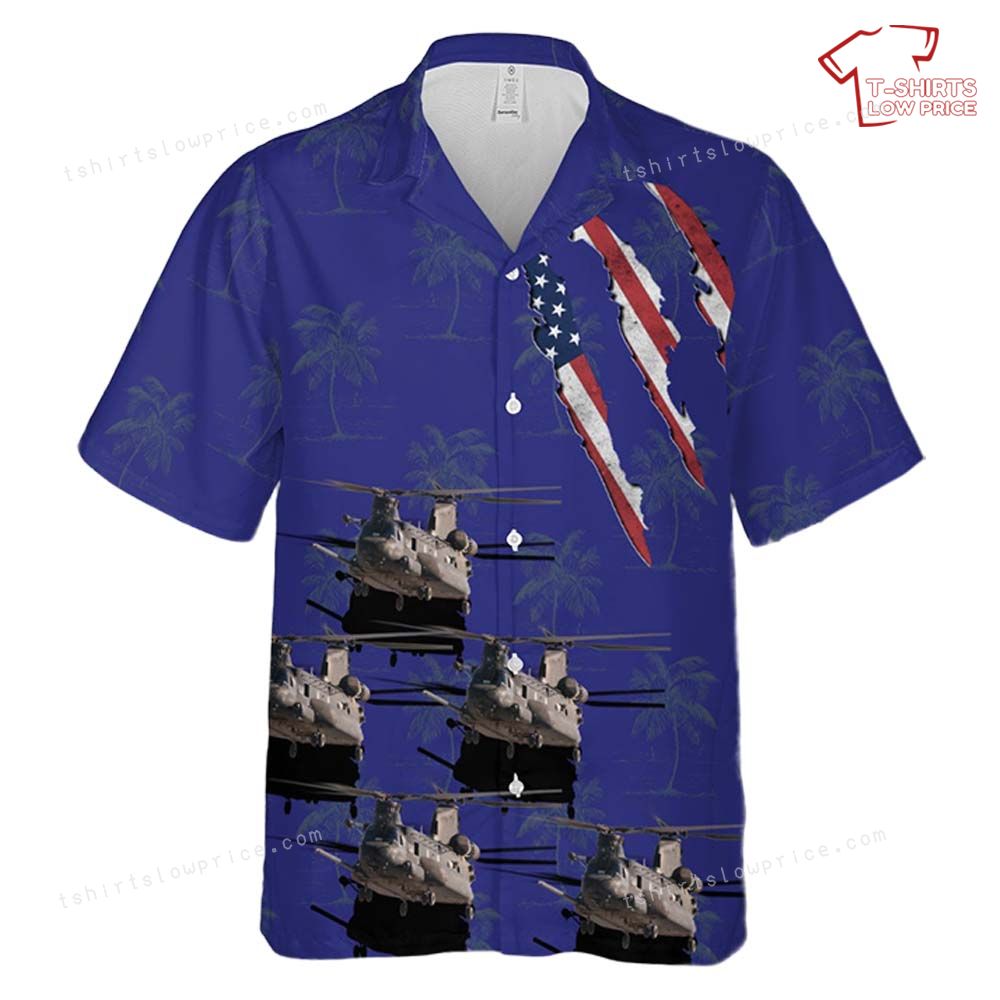 This Hawaiian shirt is a vibrant tribute to the US Army's elite aviation unit, the Night Stalkers. The artwork features multiple MH-47E Chinook helicopters, skillfully intertwined with palm trees, representing both military might and leisurely tropical landscapes. The emblem on the back symbolizes honor and dedication, while the front displays the iconic stars and stripes, adding a touch of patriotic flair. The art is not merely an illustration but a narrative of bravery, precision, and commitment to excellence.