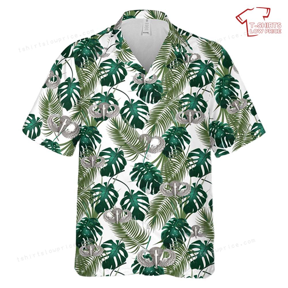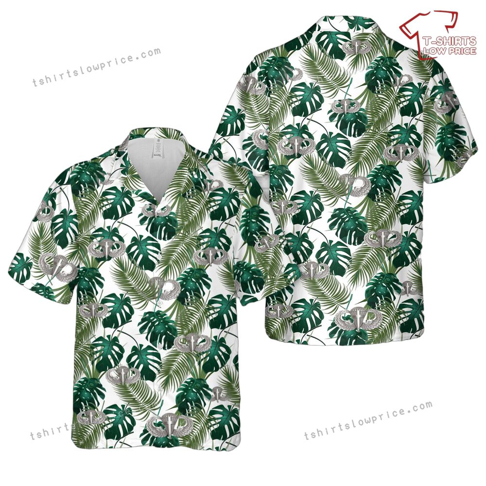 Step into a world where vintage military charm meets the breezy essence of the tropics. This shirt captures the bold essence of WWII-era aesthetics with a modern twist. Perfect for history enthusiasts and style aficionados alike, this shirt is a nod to the past while celebrating the vibrant present. The intricate detailing of the parachute wing badge offers a distinct touch, making it a standout piece in any wardrobe.