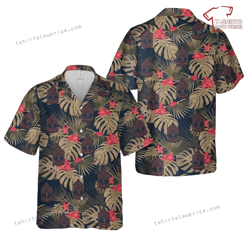 Step into a vibrant blend of military heritage and island charm with this unique design. Featuring the iconic US Army Dress Chevron for Hospital Sergeants from the World War I era, this shirt offers a nod to history while bringing a fresh tropical twist. The chevrons are thoughtfully placed amidst lush Hawaiian foliage and blooming red hibiscus flowers, creating a striking contrast that combines historical significance with vacation vibes. Perfect for history buffs or anyone who loves distinctive and meaningful designs.