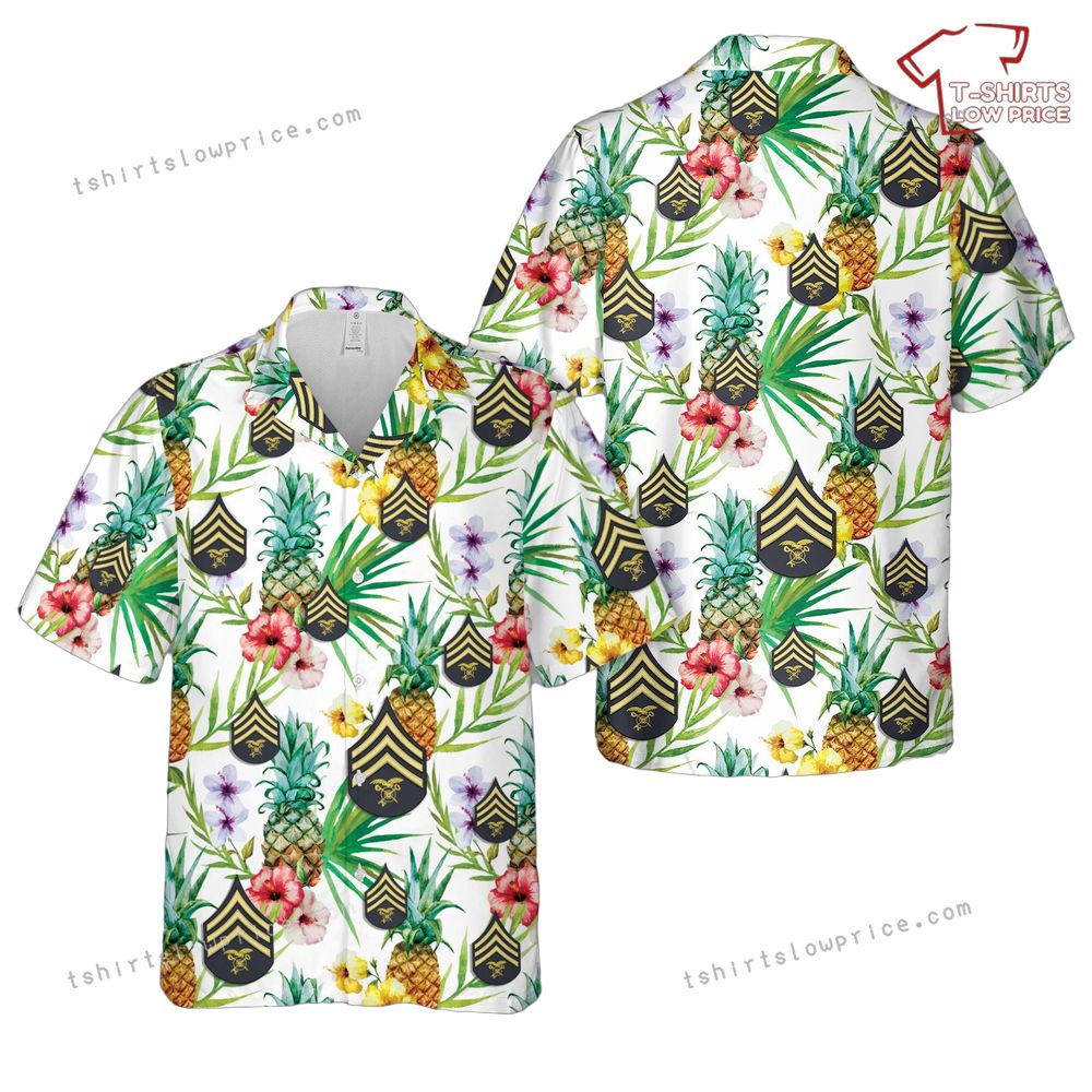 Infuse your wardrobe with a unique blend of military tradition and tropical style with this stunning Hawaiian shirt. Featuring the US Army Dress Chevron Sergeant Quartermaster Corps insignia from the 1913-1917 era, this design honors history while capturing the laid-back essence of island life. The colorful mix of pineapples, hibiscus flowers, and tropical leaves creates a lively background, perfectly complementing the bold chevrons. This shirt tells a story of heritage and pride, making it a standout piece for any collection.
