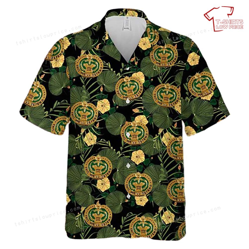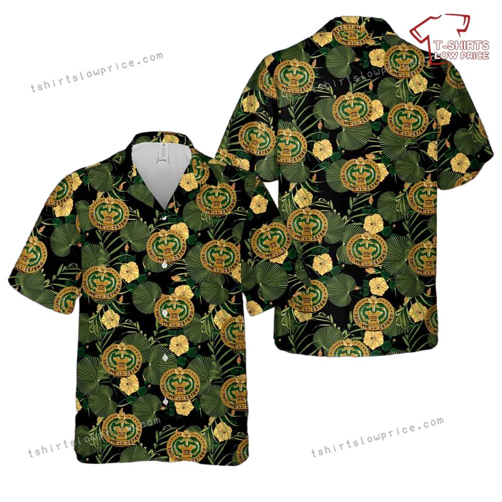 Related keywords: Army drill badge shirt, tropical military design, hibiscus badge print, U.S. Army Hawaiian apparel