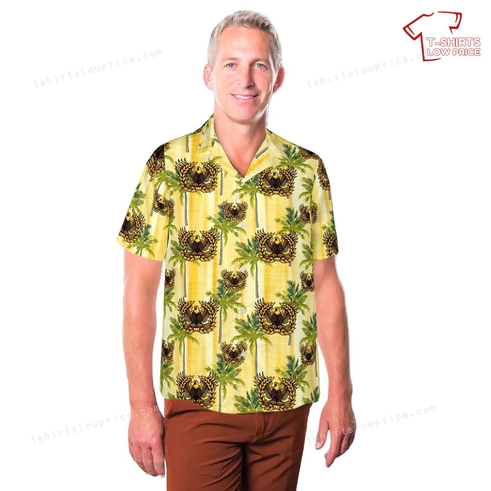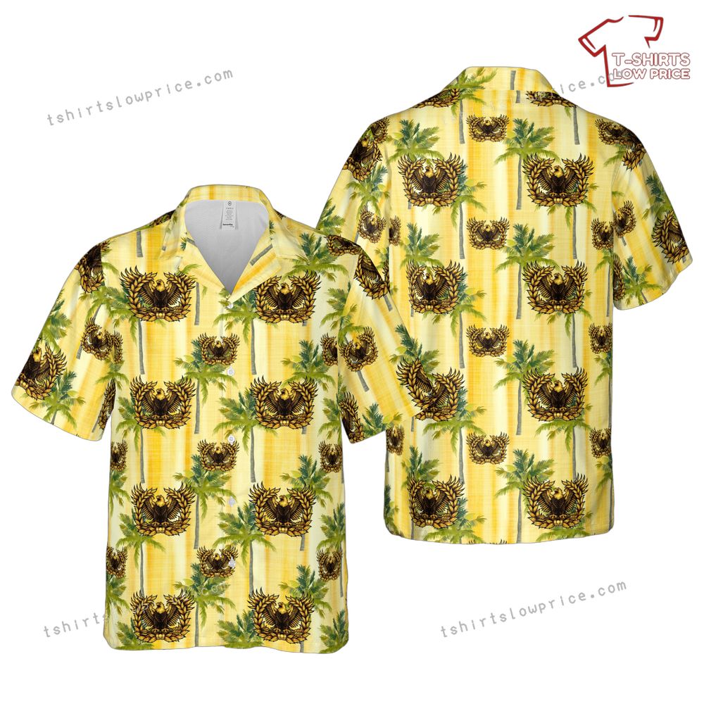 The artwork on this Hawaiian shirt combines the powerful imagery of the US Army Eagle Rising Warrant Officer emblem with a serene tropical landscape. The eagle, a universal symbol of courage and freedom, is intricately detailed, capturing its majestic essence. Set against a bright, sunlit yellow palette, the palm trees evoke a sense of relaxation and summertime joy. Together, these elements create a harmonious and inspiring design that honors the strength and resilience of military personnel while celebrating the beauty of tropical environments.