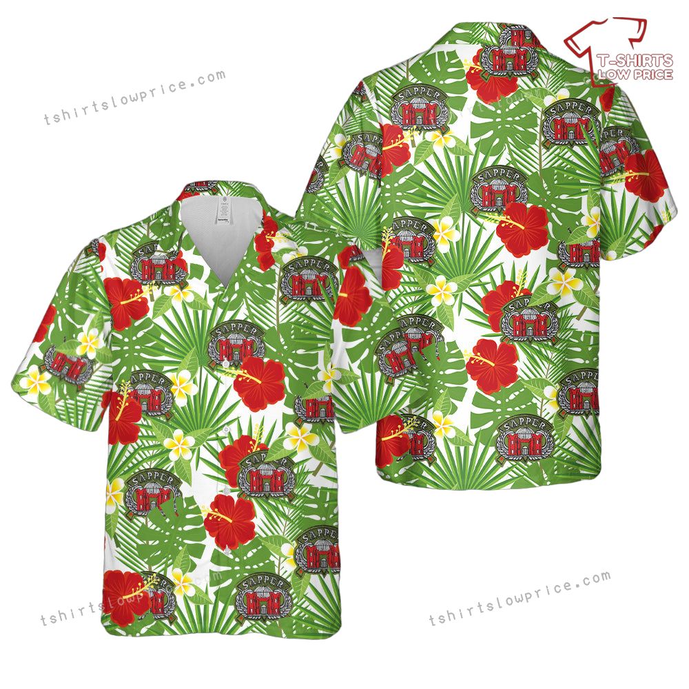 This vibrant Hawaiian shirt showcases the bold spirit and dedication of US Army Engineer Combat Sappers, complete with the iconic Airborne Wings Badge. Combining military pride with tropical flair, the design features intricate badge graphics surrounded by lush greenery and bright tropical flowers. Perfect for standing out at casual gatherings while honoring the specialized skills and sacrifices of combat engineers, this shirt delivers a unique blend of patriotism and island vibes.