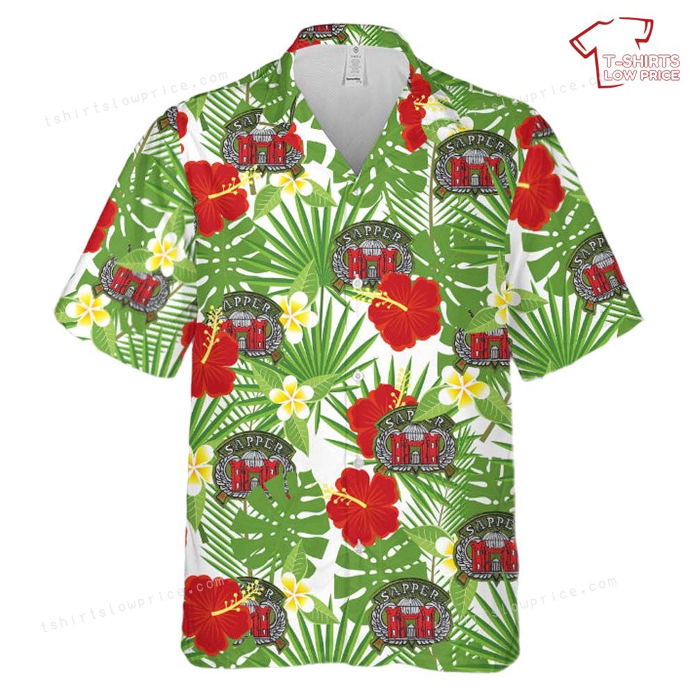 Related keywords: US Army Engineer badge, combat sapper design, tropical military shirt, airborne wings Hawaiian shirt