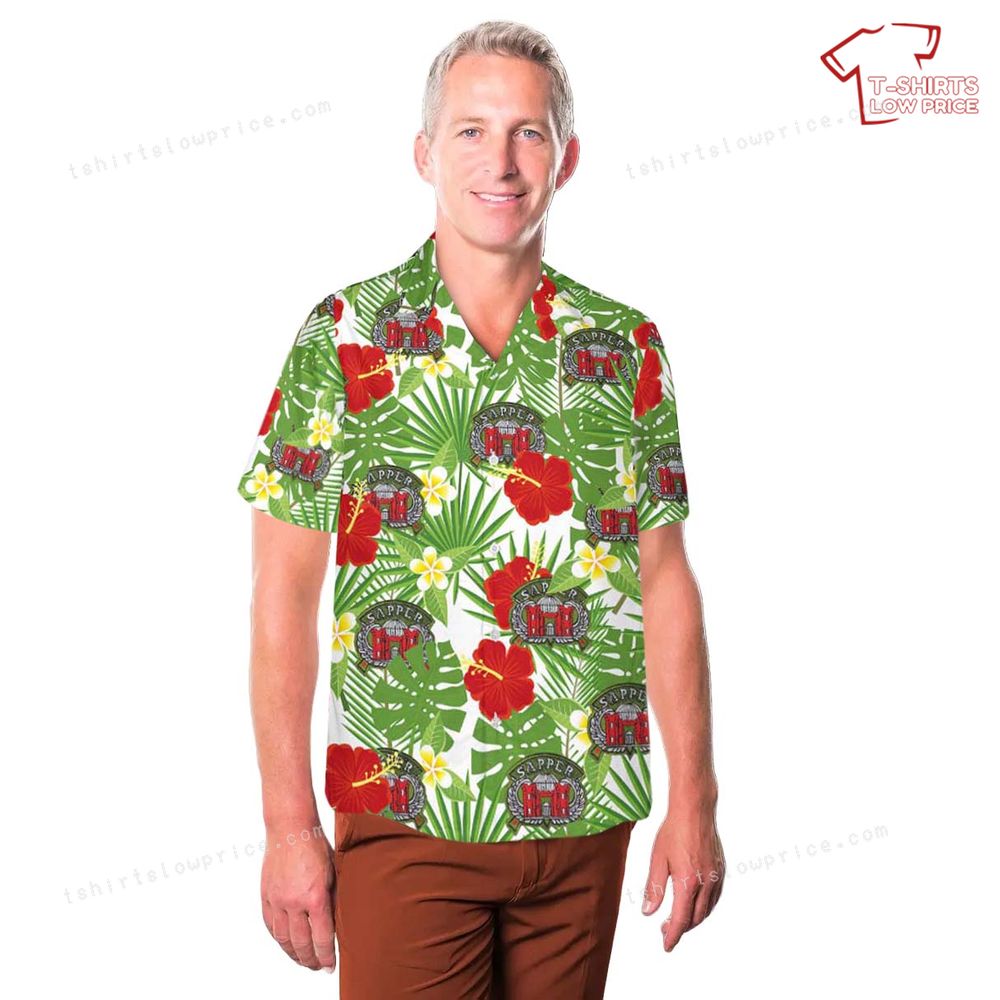 The graphic brings together a stunning mix of themes. At its center is the US Army Engineer Combat Sapper badge, symbolizing strength, resilience, and honor. The vibrant red shield contrasts beautifully with the detailed gold wings, standing out against a lush backdrop of tropical greens and bold red hibiscus flowers. Yellow plumeria accents and palm leaves further enhance the design, creating a lively tropical scenery that complements the badge's sense of distinction. The interplay of these elements makes the shirt both visually appealing and meaningful, celebrating the unique role of combat engineers in a dynamic and colorful way.