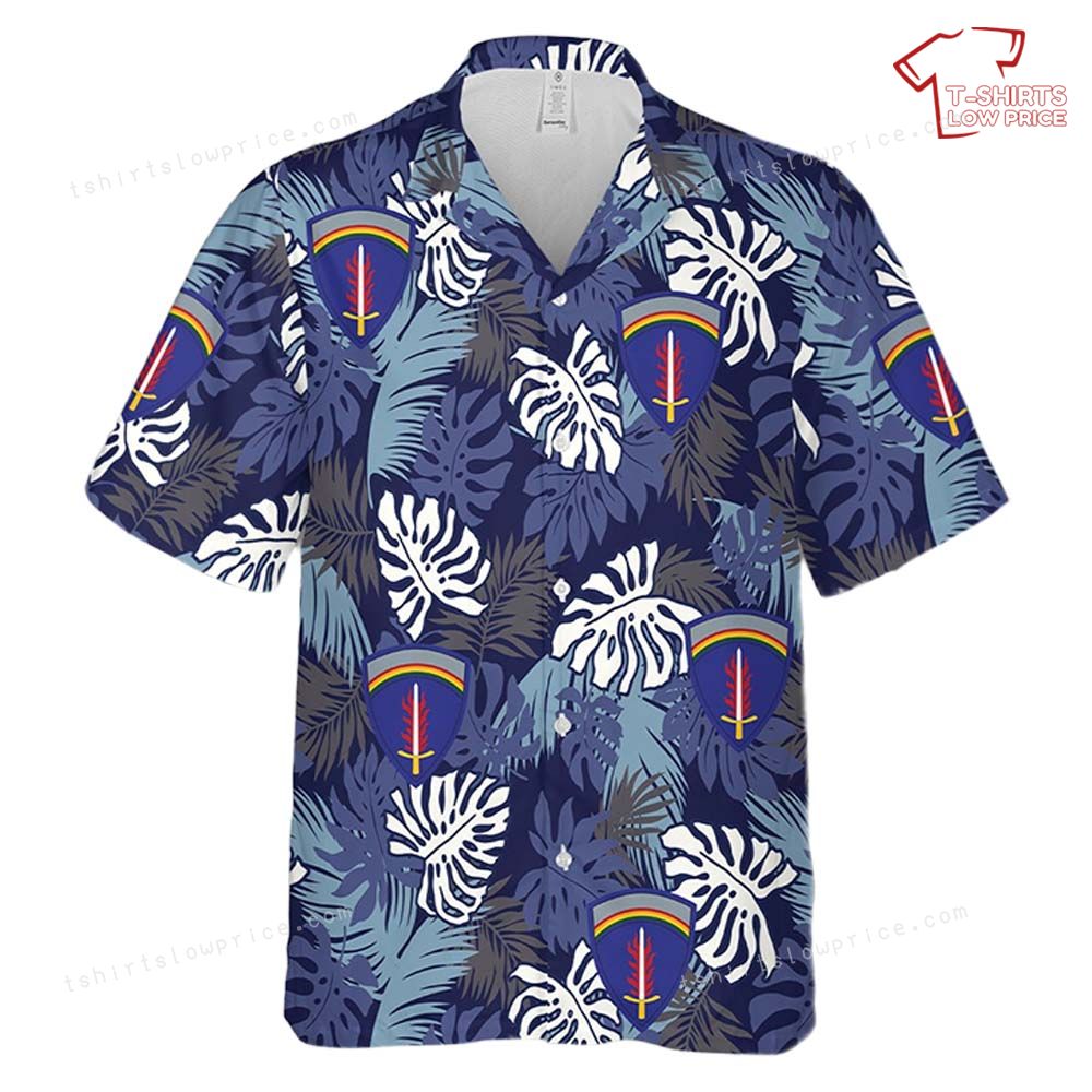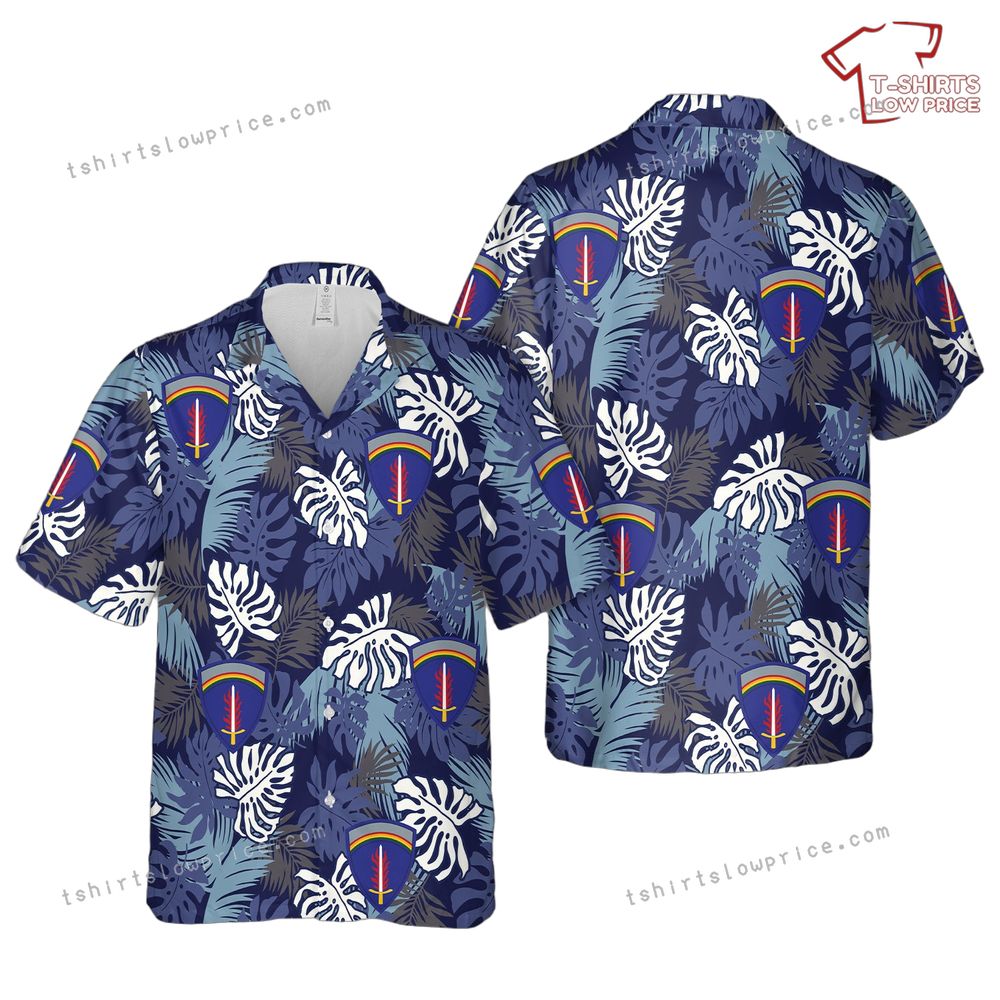Related keywords: US Army Europe shirt, military tropical design, patriotic Hawaiian clothing, USAREUR insignia apparel