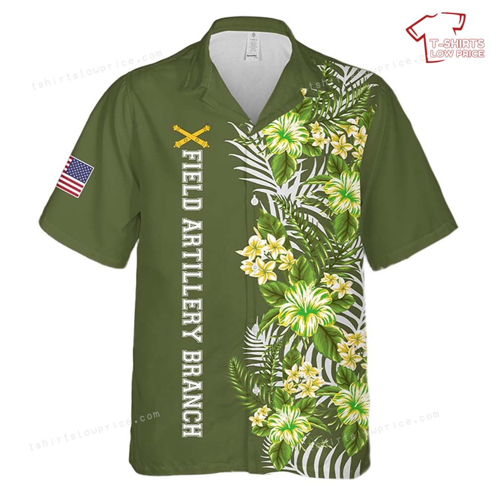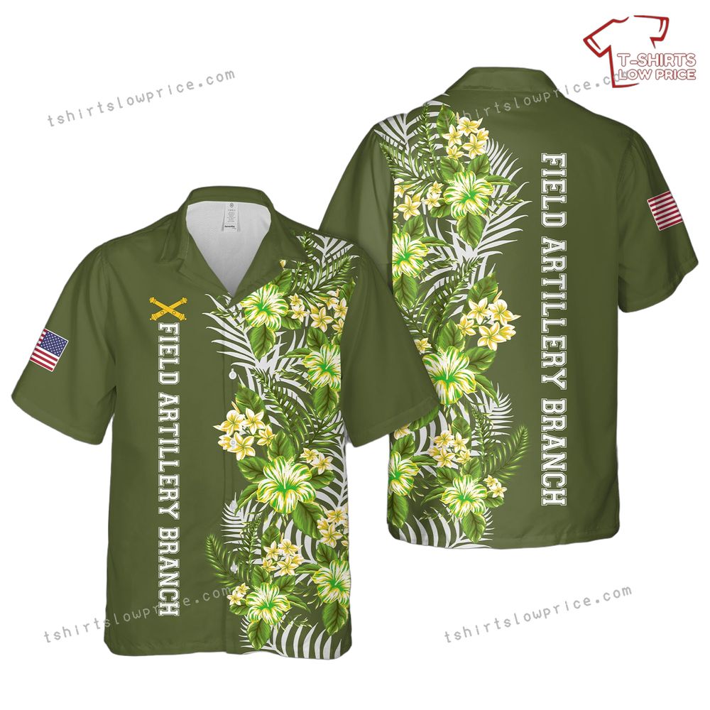 Related keywords: Field Artillery Branch shirt, military Hawaiian shirt, US Army floral apparel, patriotic tropical shirt
