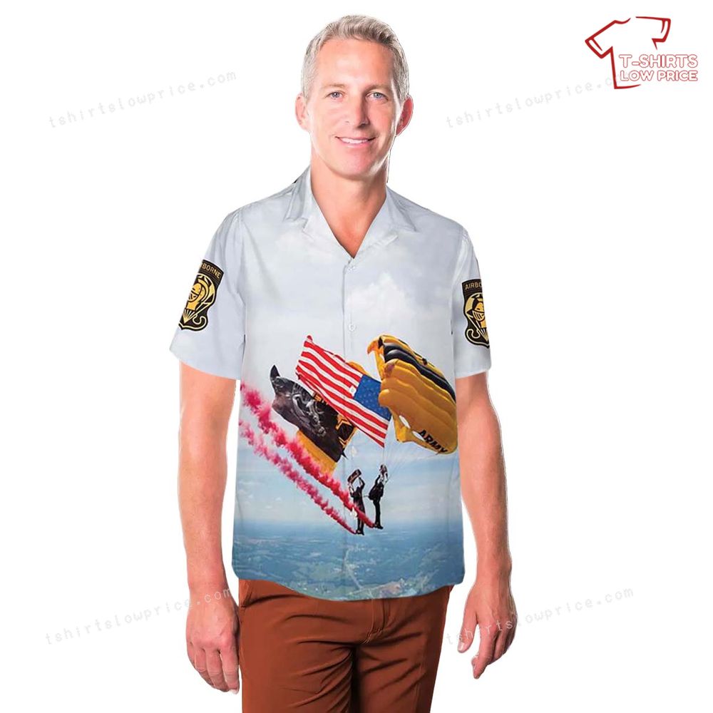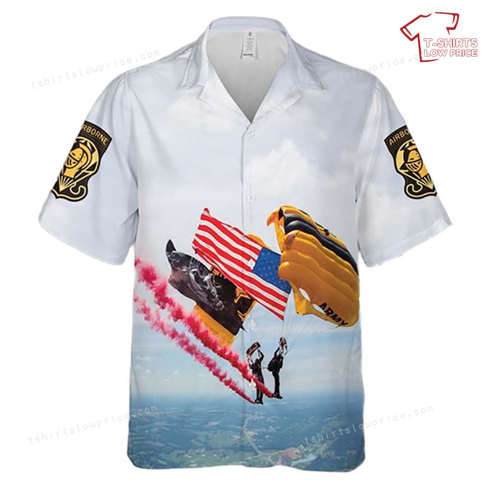 Related keywords: Golden Knights air show, skydiving team shirt, US Army parachute design, patriotic Hawaiian shirt